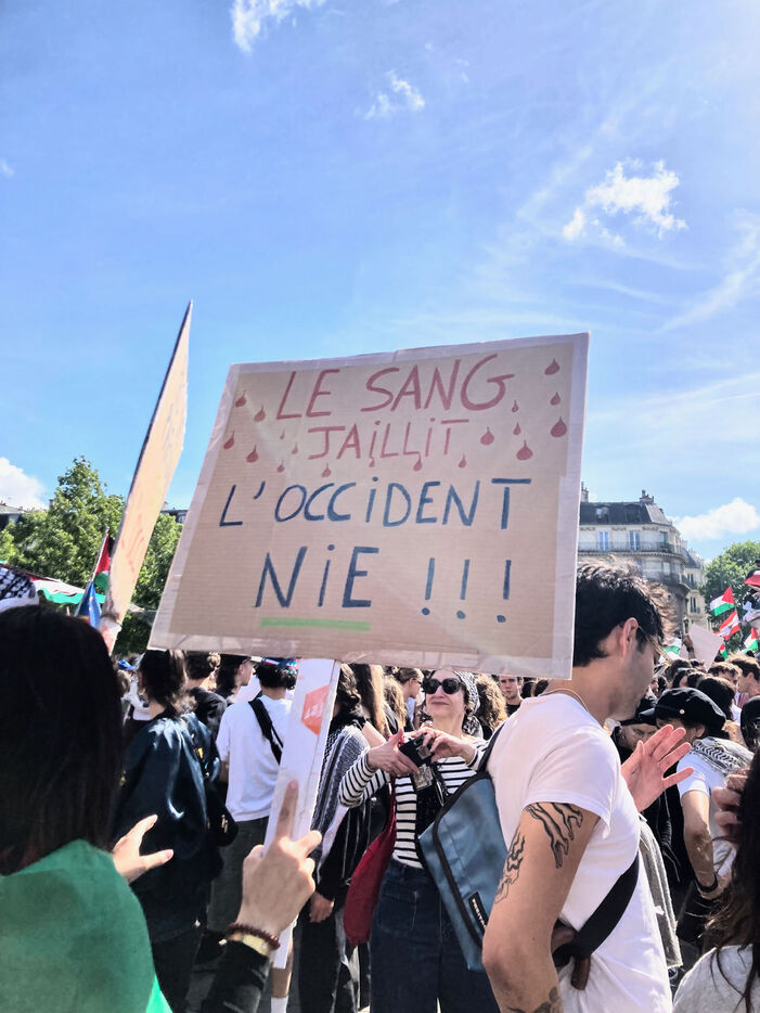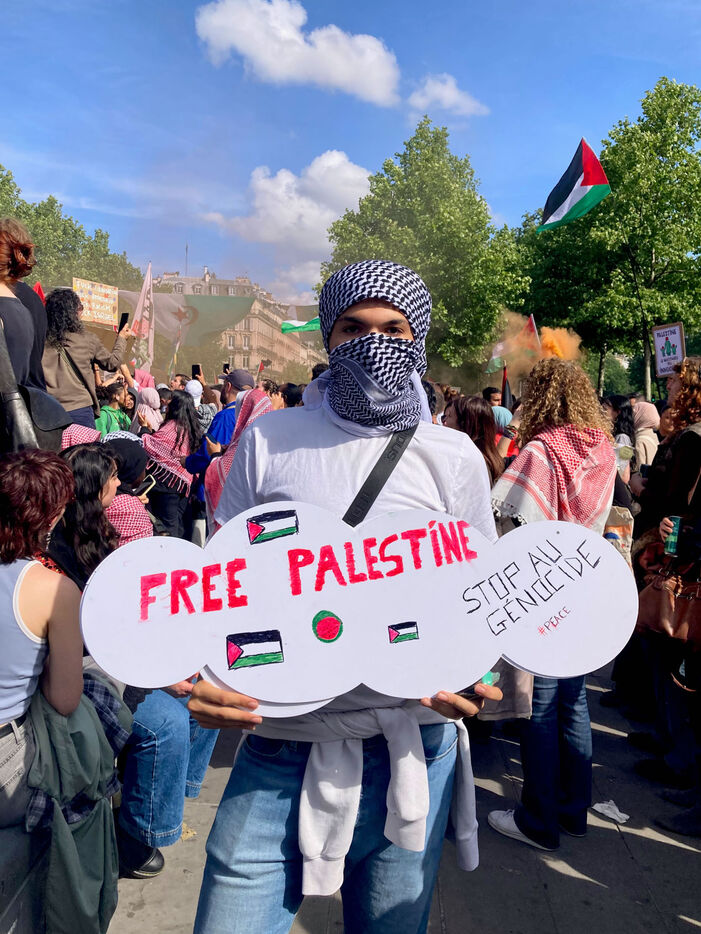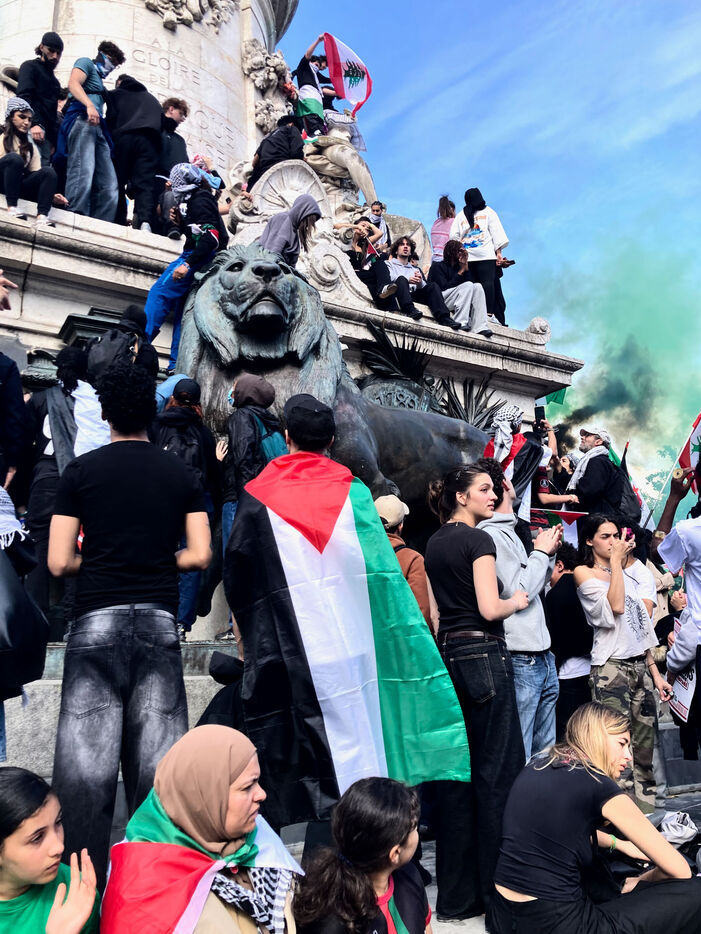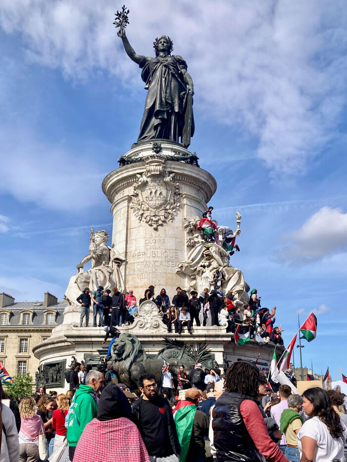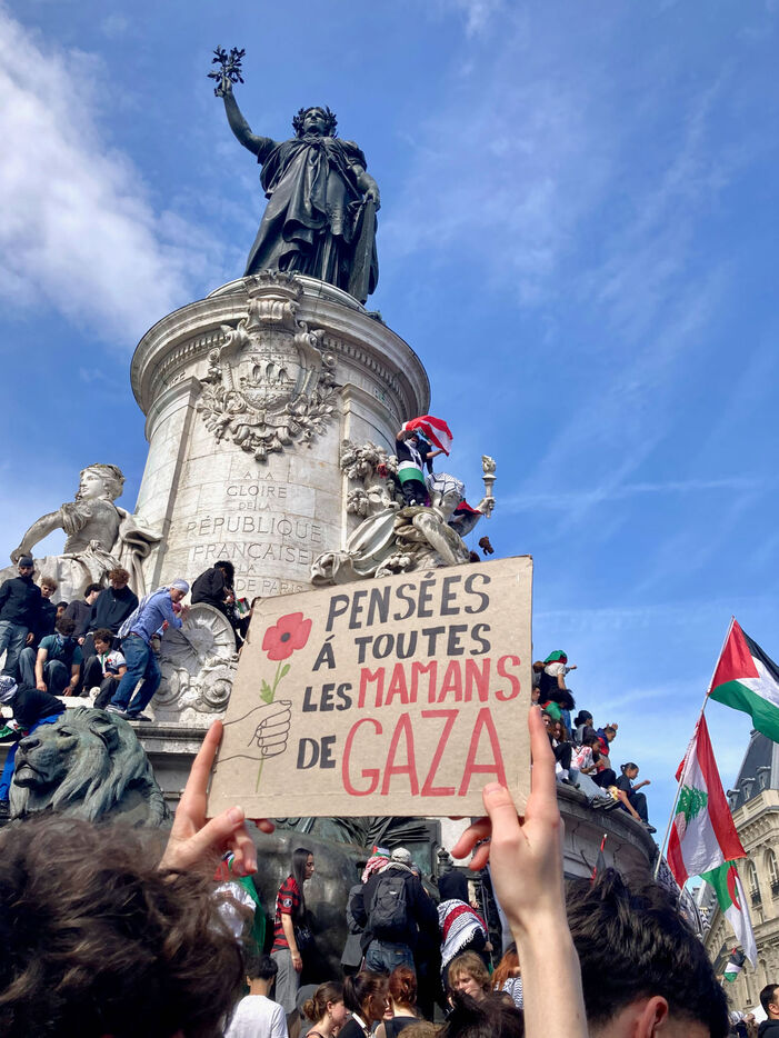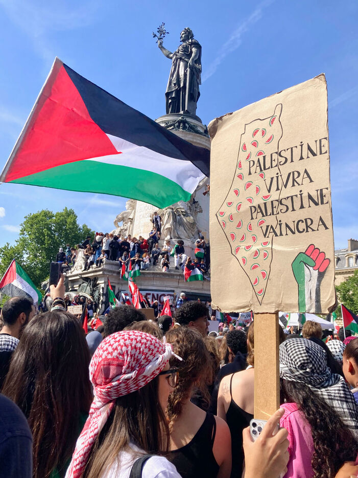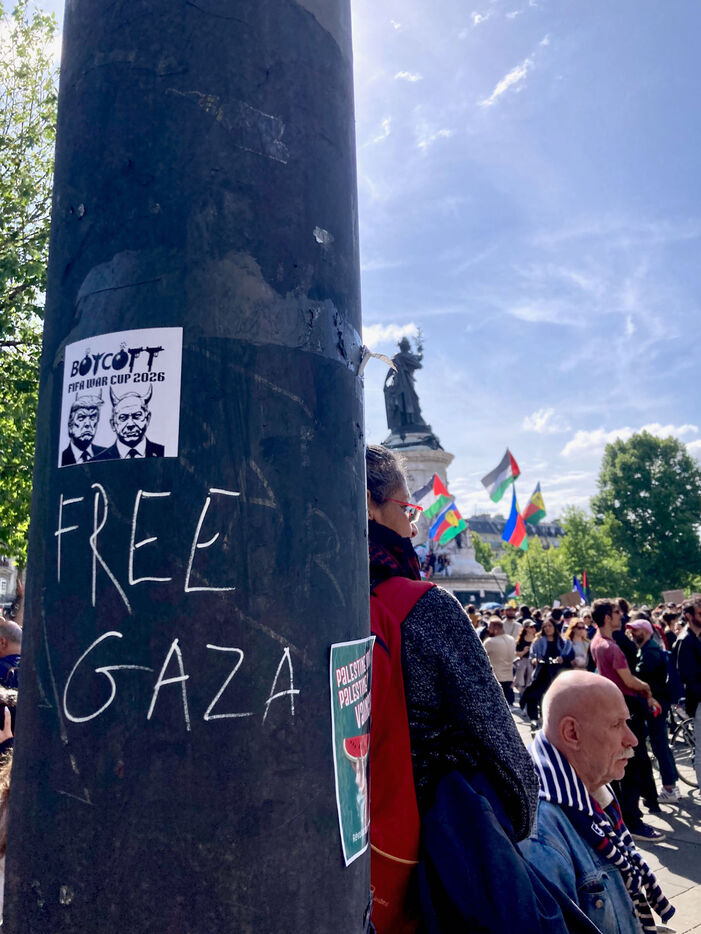 At the call of several youth organizations (Union etudiante, Union syndicale lyceenne, Comite Palestine Sorbonne, Rassemblement pour l'egalite et la democratie, Comite Palestine Sciences Po), thousands of demonstrators gathered in support of Palestine and to denounce the genocide being carried out by the Israeli government, on Sunday May 25, 2025 at Place de la Republique, Paris, France.Sur un poteau, le tag FREE GAZA a ete marque a la craie devant la statue de la Place de la Republique.