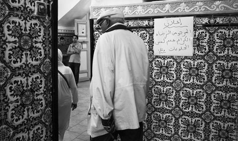 4. "The delights of life": At the entrance to a shop, a most innocent notice: "We ask our dear customers not to touch the pastries". Then walked in a woman, and behind her a man who seems to be following her. And there "pastries", which in Arabic is written "sweets", becomes in my facetious mind "sweets", " delicacies ", "delights". Here we are warned: please do not touch the delights of life. Pleasure is suspicious, supervised, prohibited, reserved for conjugal duties... It is by society but also by the criminal law: it is forbiden to have a relation without a marriage certificate. Please ask couples who are not in good standing to behave properly... But all this is just a photographer's fabrication: this couple was obviously married. Fortunately, appearances have been saved.