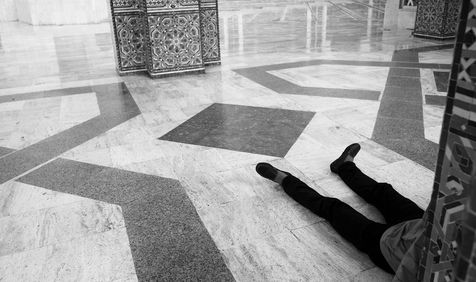 2. « Le dormeur du val » : J'aime photographier les scènes de rue et rendre les atmosphères très différentes que l'on peut y trouver. Les passants deviennent les personnages de mes images, mais ce sont des protagonistes que je plonge souvent dans le mystère : photographiés en contre-jour, de dos, en flou de mouvement, hors champ ou hors profondeur de champ, leur présence est plus suggérée que décrite. Ce qui me permet de solliciter l'imagination du spectateur : qui est cette personne, que fait-elle exactement ? Nulle réponse, chacun est livré à ses projections et suppositions personnelles. Et cet homme que j'ai trouvé affalé au pied d'une mosquée, fait-il tout simplement une sieste, ou tel un « dormeur du val » plus mort qu'endormi s'en remet-il à la destinée et à l'omnipotence divine, abandonnant toute velléité de libre arbitre et tout souffle de vie propre ?