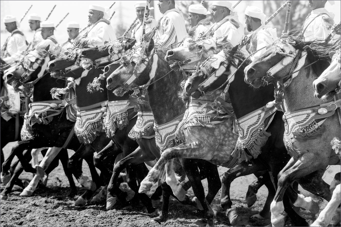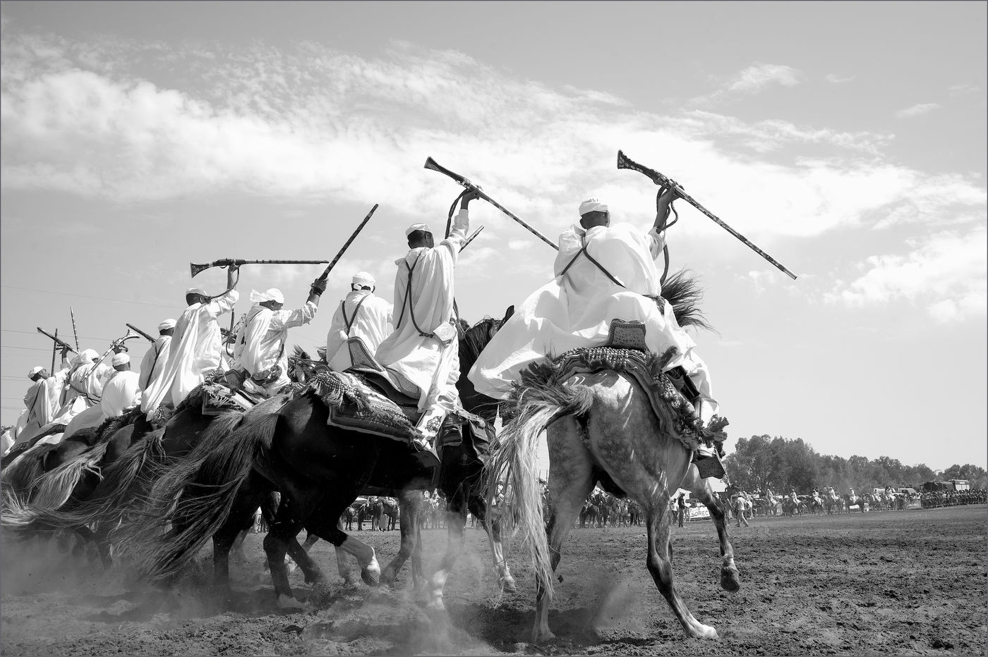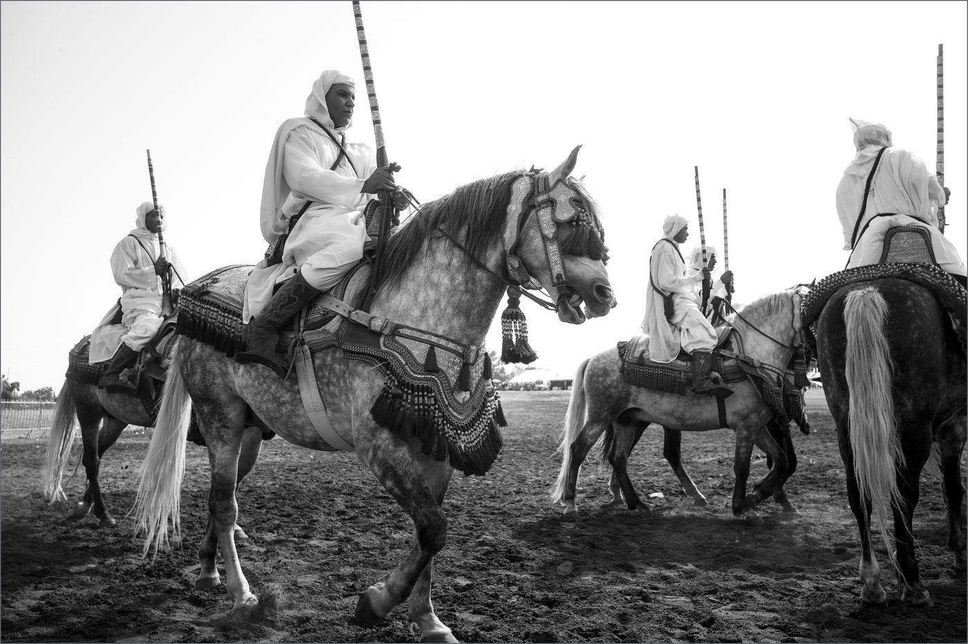 The photographs were taken during the Kenitra tbourida day on May 2, 2016, as part of the calendar of competitions organized each year throughout Morocco by the SOREC (Royal Society for the Encouragement of the Horse). "The competitions reward in particular the perfect alignment, the quality of the start, the behaviour of the riders, the harnessing of the horses, the art in the execution of the rifle game and the precision and simultaneity of the detonations carried out by each troop of tbourida (sorba) composed of 11 to 15 aligned riders. »