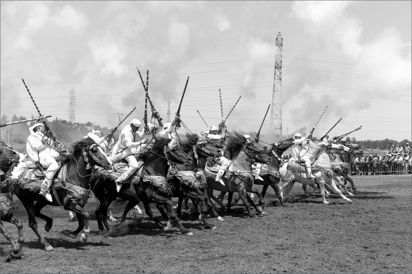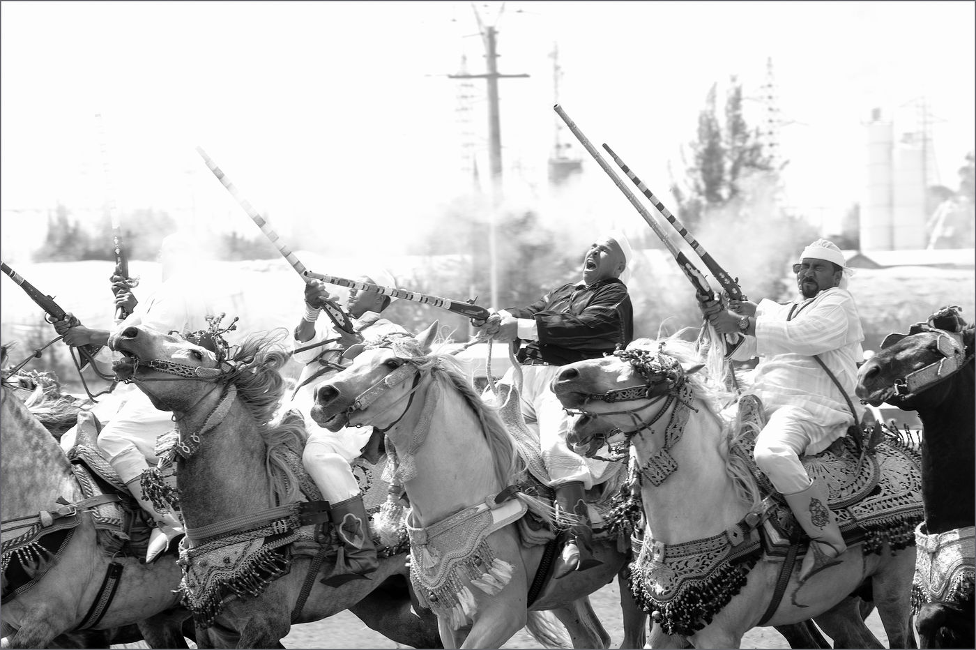 « The fantasia / tbourida (baroud means gunpowder) is a traditional equestrian art practiced in the Maghreb, manifested by the simulation of military assaults. It most often takes the form of equestrian evolutions during which riders, equipped with black powder rifles and riding richly harnessed horses, simulate a cavalry charge which ends with the coordinated firing of a salvo of their firearms. " (Wikipedia)