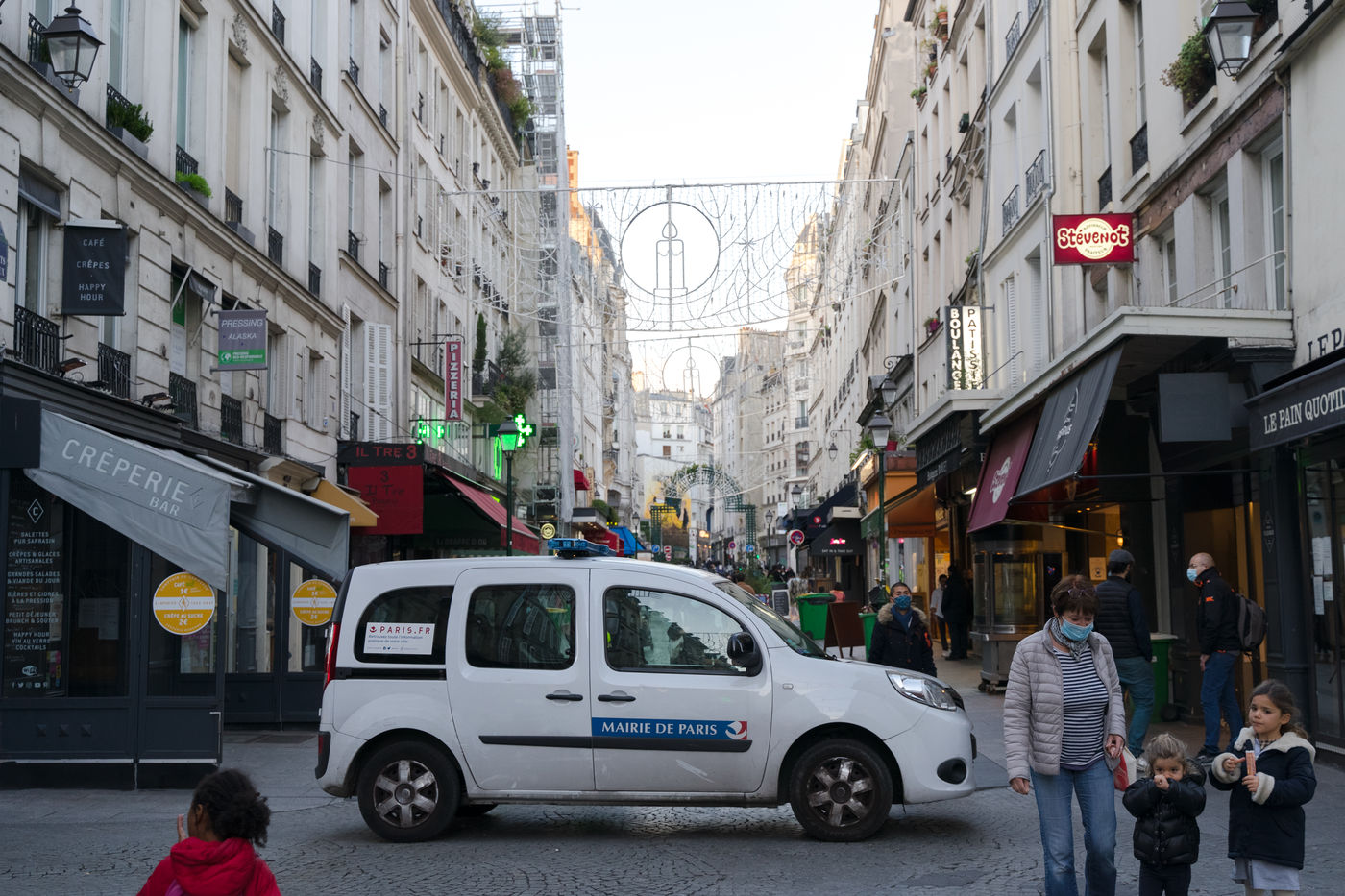 Bien que les mesures soient moins radicales, les rues sont particulièrement vides, surtout dans les quartiers touristiques. Les chaises des restaurants sont empilées et la police patrouille dans les quartiers les plus fréquentés. Seuls les plus précaires, les SDF, les livreurs de Uber Eats en Vélib, sont présents partout. Rue Montorgueil, la pharmacie a installé un stand pour se faire tester pour le virus, plus loin vers Beaubourg un couple de personnes âgées essaye de trouver un livre dans une librairie qui pratique le "Click & Collect".