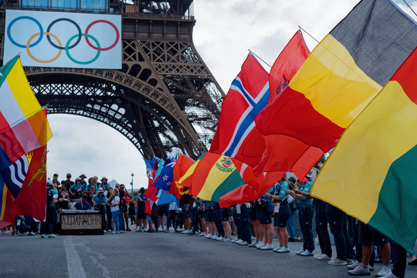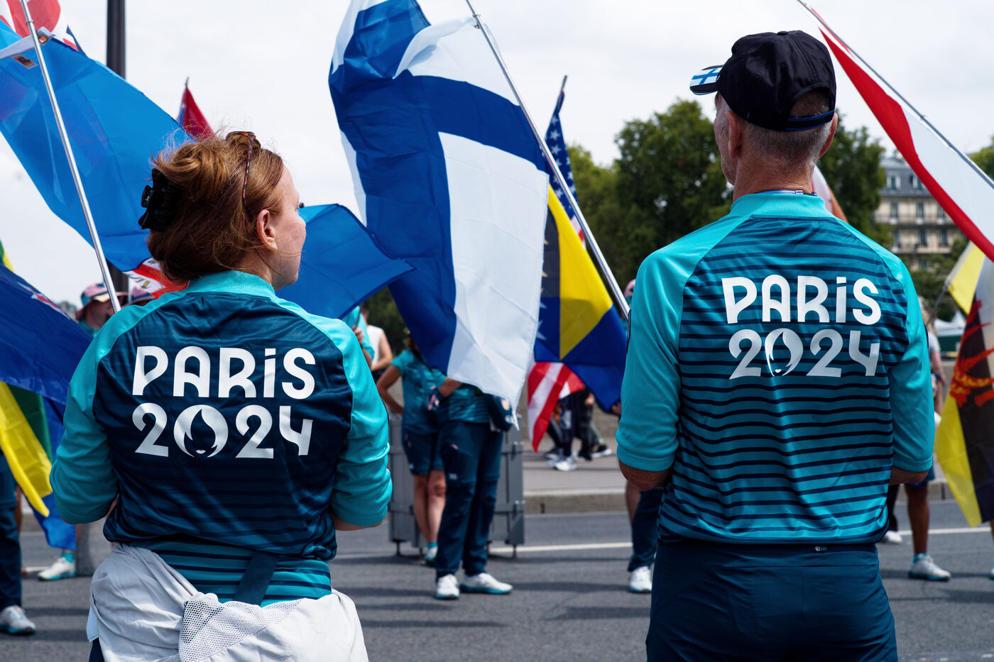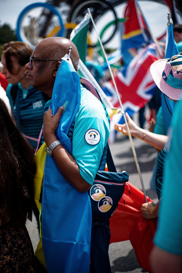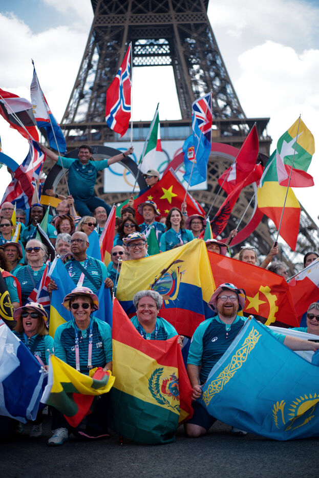 Tour Eiffel - Paris - France, volunteers gather for a grand parade in Olympic colours one year after the opening ceremony of the 2024 Olympic Games.