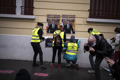 Alternatiba ANV Rhone, Extinction Rebellion, Les amis de la Terre and Youth for Climate activists challenge once again elected members of french parliament about Amazon's new warehouse project. Lyon, December 4th, 2020. Photography by Bastien Doudaine / Hans Lucas.