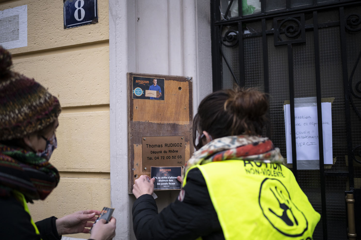 Les militants d'Alternatiba ANV Rhone, d'Extinction Rebellion, des Amis de la Terre et de Youth for Climate poursuivent leur lutte contre l'expansion d'Amazon en France. En ciblant les permanences des deputes de la majorite (LREM), ils souhaitent alerter sur les consequences jugees nefastes du developpement d'Amazon sur l'ecologie et l'emploi. Une conference de presse s'est tenue devant la permanence du depute de la premiere circonscription du Rhone, Thomas Rugidoz. Ils ont pu le rencontrer brievement et par hasard a la fin de leur action. S'en sont suivi quatre controles d'identite et une audition au commissariat du 5eme arrondissement, pour deux militants, une journaliste et un photographe independant.