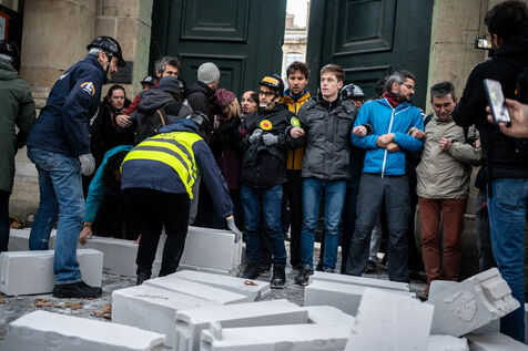 Around 200 activists from eight environmental movements (including ANV-Cop21, Greenpeace, Extinction Rebellion, Alternatiba, Dernière Rénovation...) symbolically blocked the entrance to the Ministry of Ecological Transition, renamed the "Ministry of Ecological Betrayal" for the occasion, in reaction to government announcements deemed "out of touch" with ecological planning.