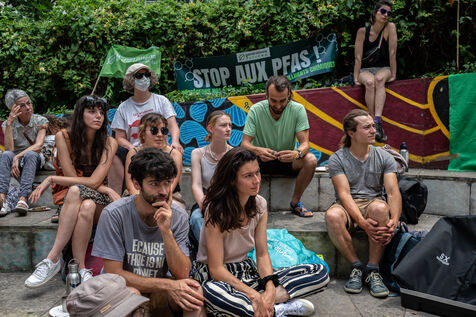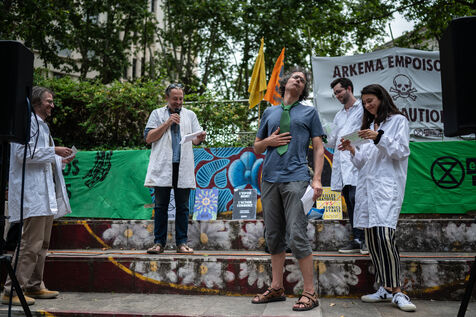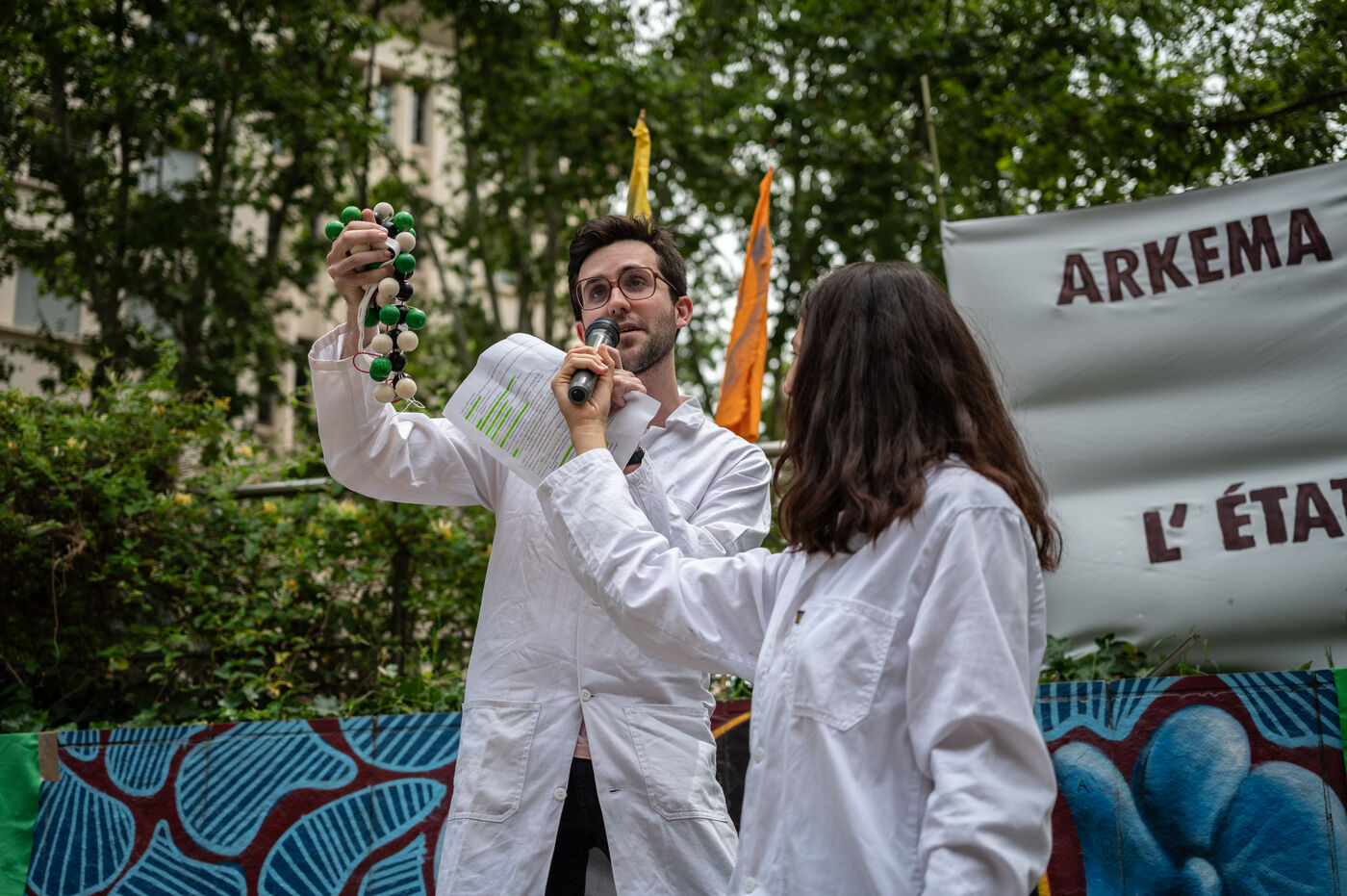 Ahead of the trial of eight climate activists from the Extinction Rebellion movement, a support committee organized speeches on the subject of PFAS pollution. Theatrical intervention by "scientists in rebellion", white coats, and chemical company executive in tie.