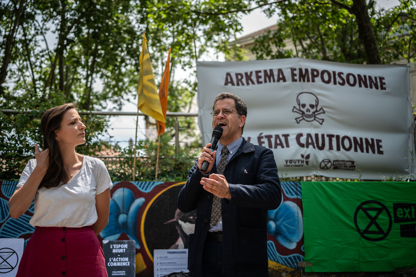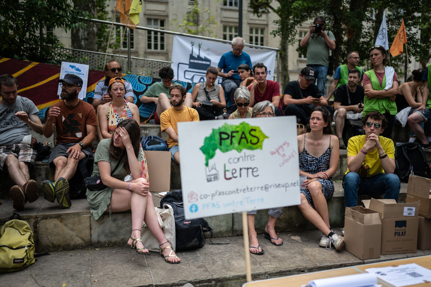 Avant et à l'issue le procès de huit activistes écologistes du mouvement Extinction Rebellion, un comité de soutien a organisé des prises de parole en lien avec la pollution aux PFAS. Intervention théâtrale des "scientifiques en rebellion", blouses blanches, et dirigeant d'entreprise chimique en cravate.