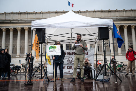 Festive demonstration before the appeal trial of the eight environmental activists from the Extinction Rebellion movement on trial for a civil disobedience action on 2 March 2024 at the Arkema chemical platform in Pierre-Bénite.