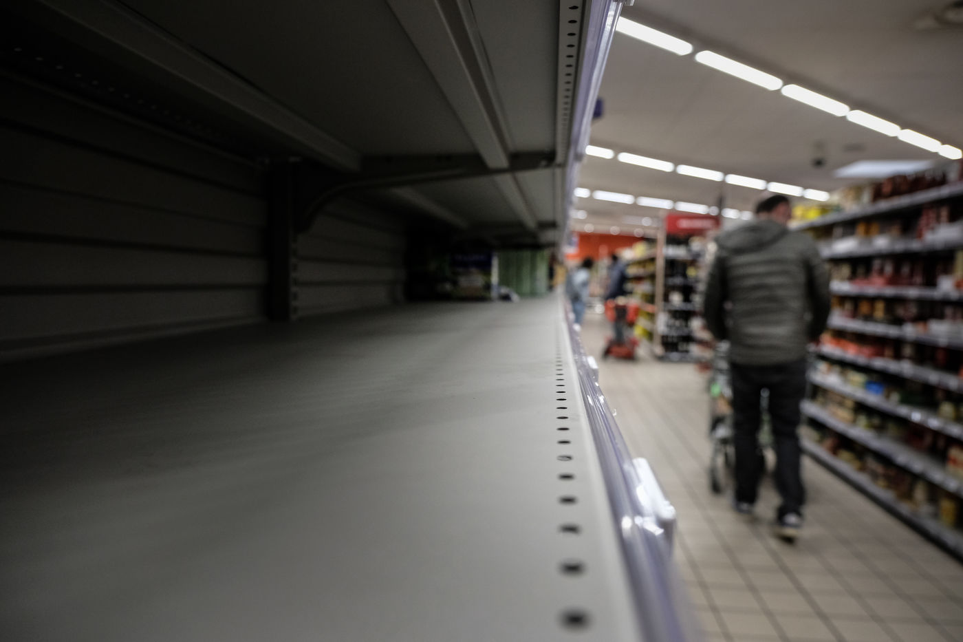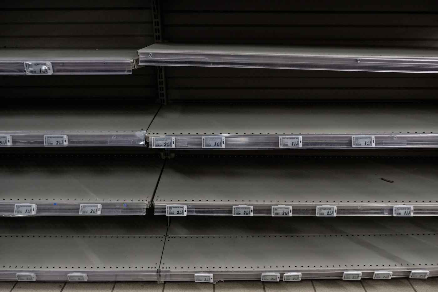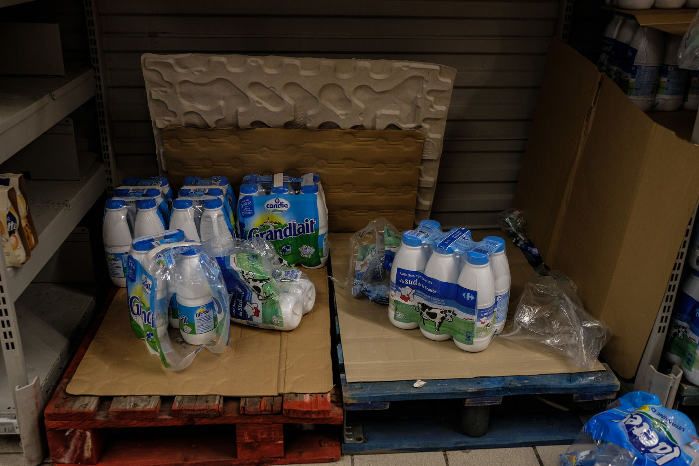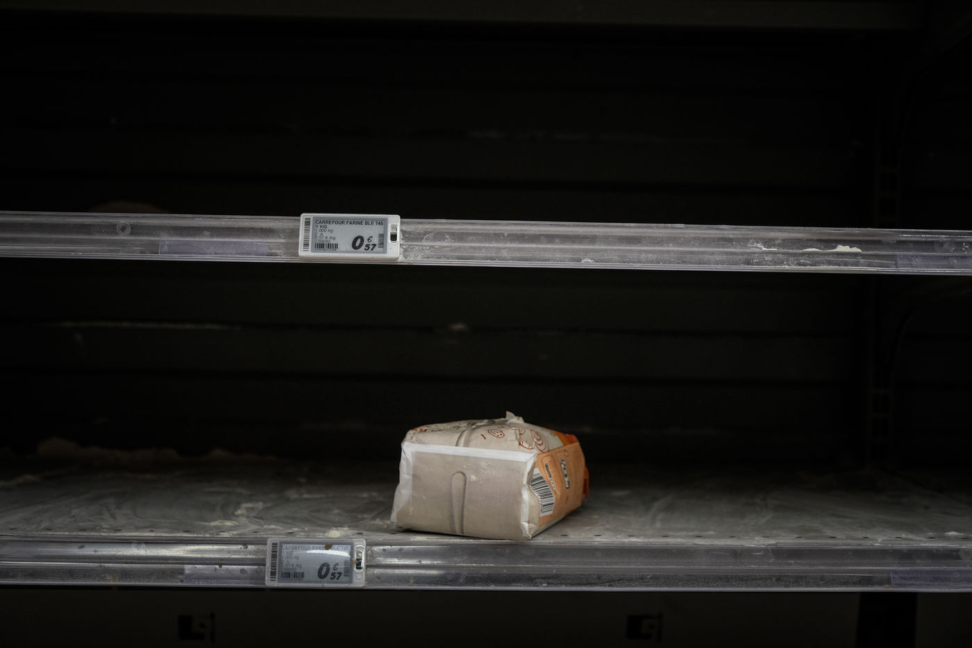 Dans les magasins les produits de premiere necessites sont pris d assaut laissant les rayons vides et saccages. Pattes, riz, sucre, farine, oeuf, lait, produit menage, papier-toilette.