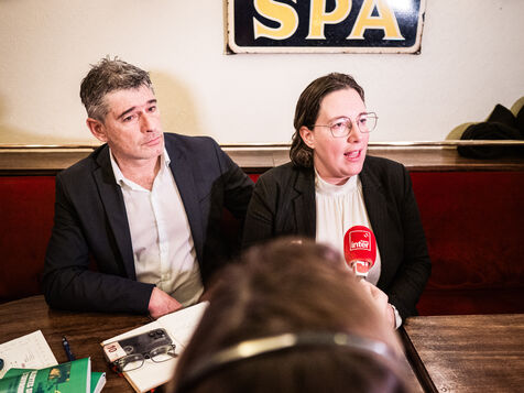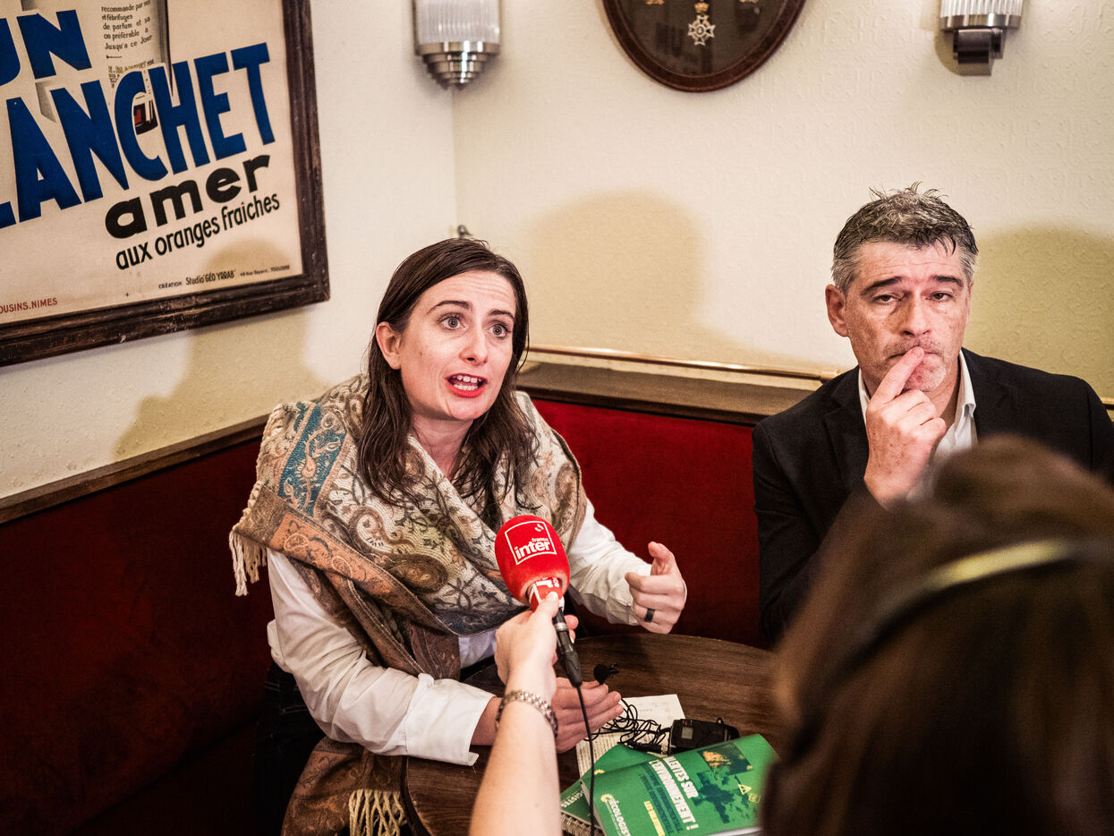Tense microphone with Marine Tondelier, Cyrielle Chatelain and Guillaume Gontard after a meeting with the Prime Minister. It was supposed to take place in front of the Hôtel de Matignon, but was moved to a bar because of the rain.