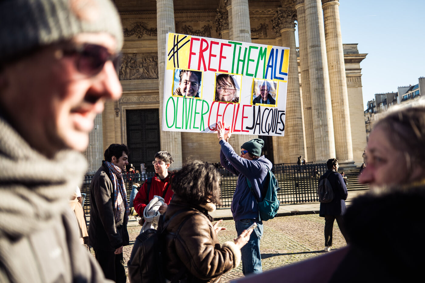 Rassemblement devant le Pantheon pour Cecile Kohler, Jacques Paris et Olivier Grondeau otages Français en Iran.
