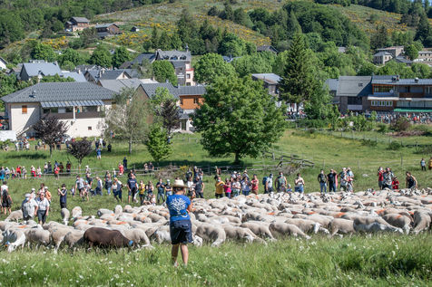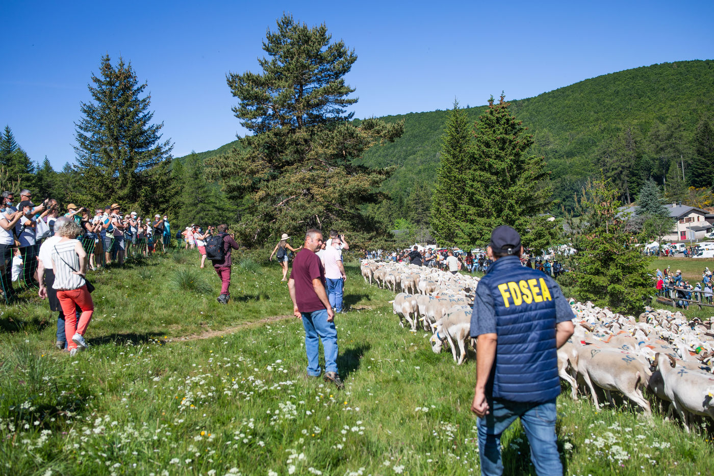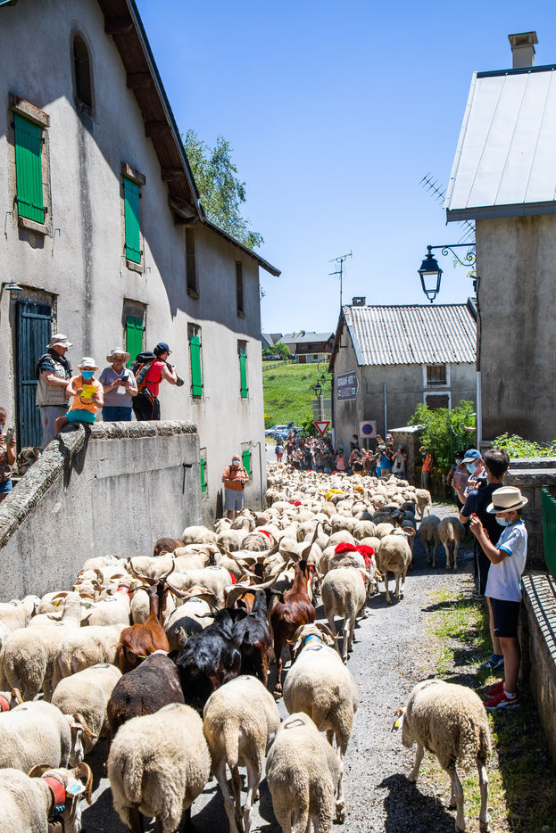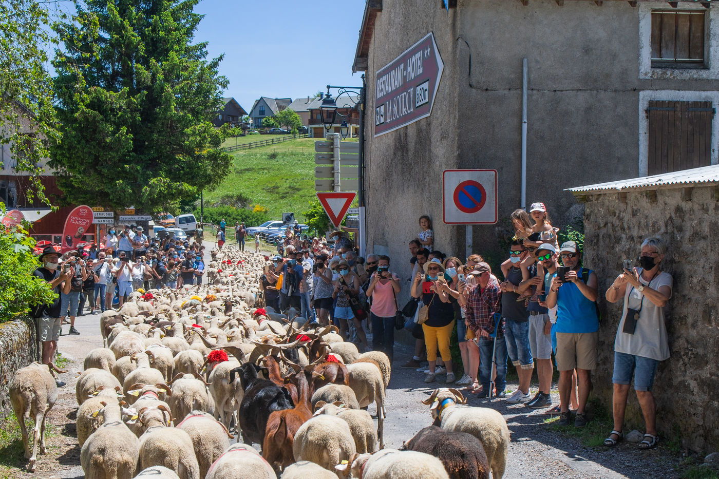 Fête traditionnelle de la transhumance estivale dans le village de L'Espérou (Gard), sur le massif de l'Aigoual. Dimanche 13 juin 2021. Les troupeaux en pâture dans les vallées l'hiver rejoignent les montagnes pendant l'estive. Ici, plusieurs troupeaux arrivent et sont célébrés par des centaines de locaux. Un marché de producteurs et des animations sont aussi au programme de la journée.