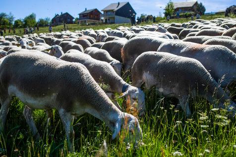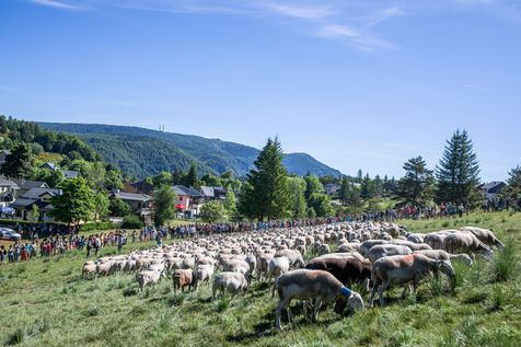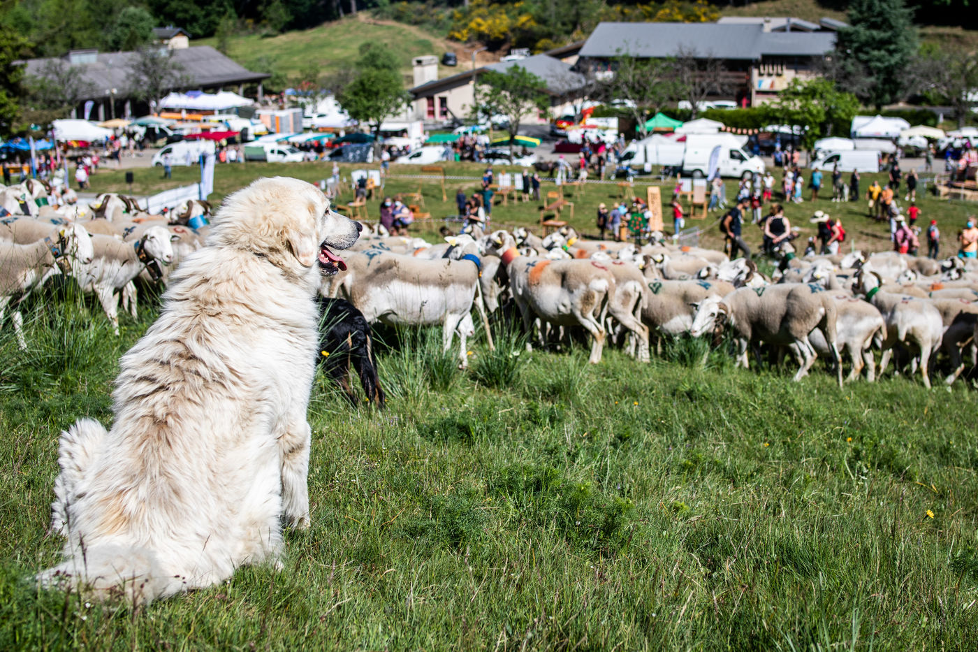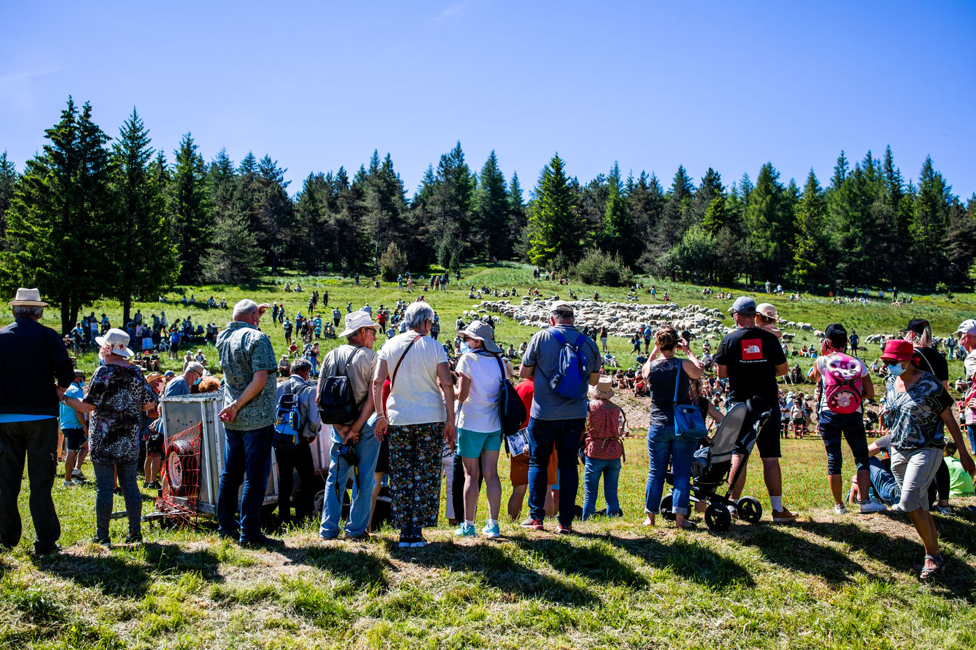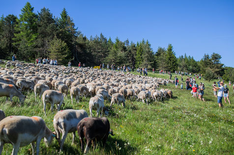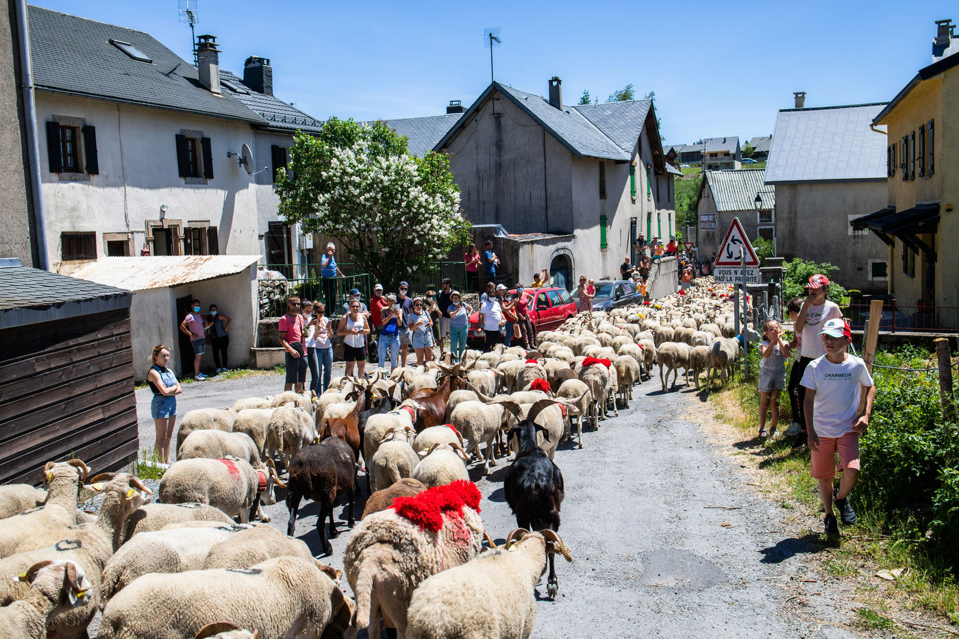 Fête traditionnelle de la transhumance estivale dans le village de L'Espérou (Gard), sur le massif de l'Aigoual. Dimanche 13 juin 2021. Les troupeaux en pâture dans les vallées l'hiver rejoignent les montagnes pendant l'estive. Ici, plusieurs troupeaux arrivent et sont célébrés par des centaines de locaux. Un marché de producteurs et des animations sont aussi au programme de la journée.