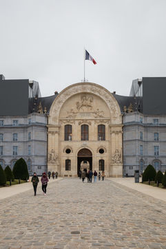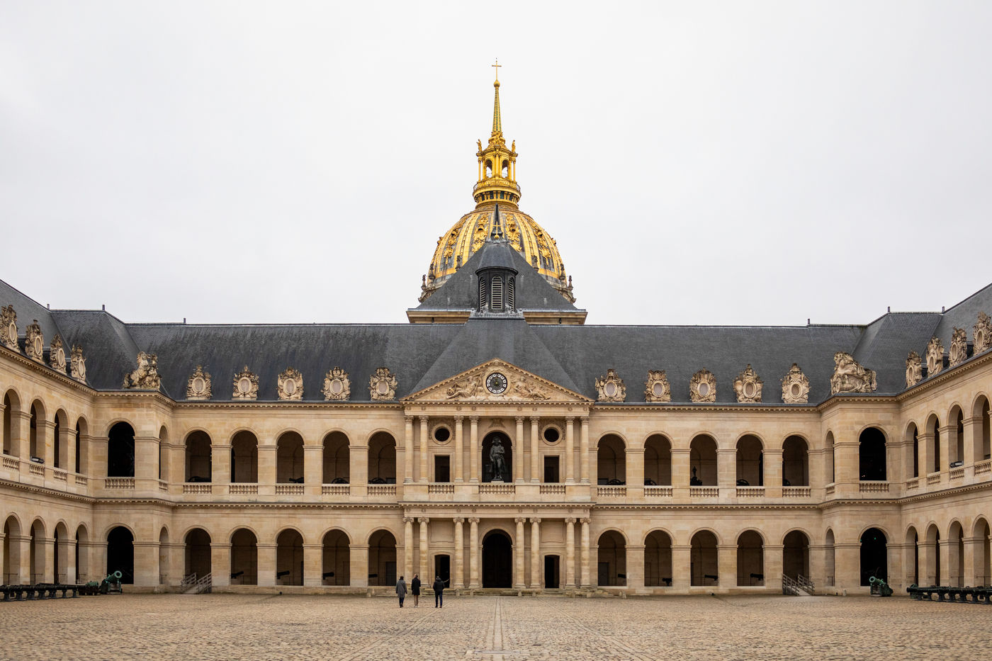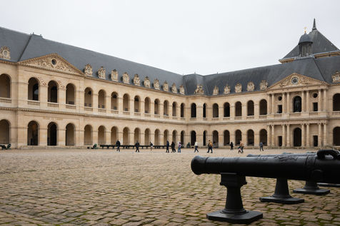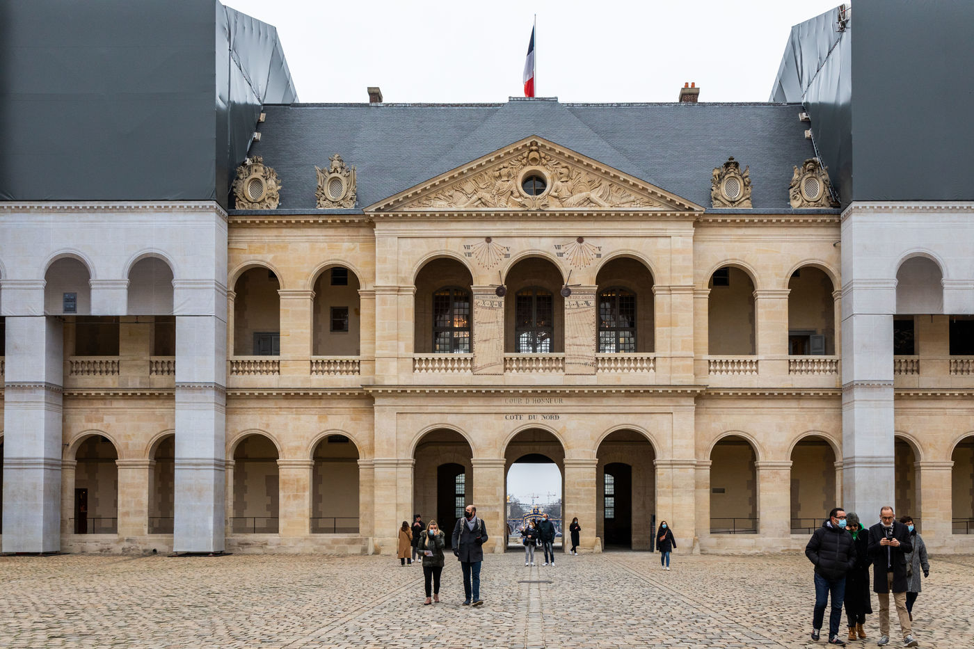 L'hôtel national des Invalides à Paris, est un bâtiment en l'honneur des forces armées. Il est construit en 1670 sous l'impulsion de Louis XIV. Illustrations du bâtiment et de la cour d'honneur, janvier 2022.
