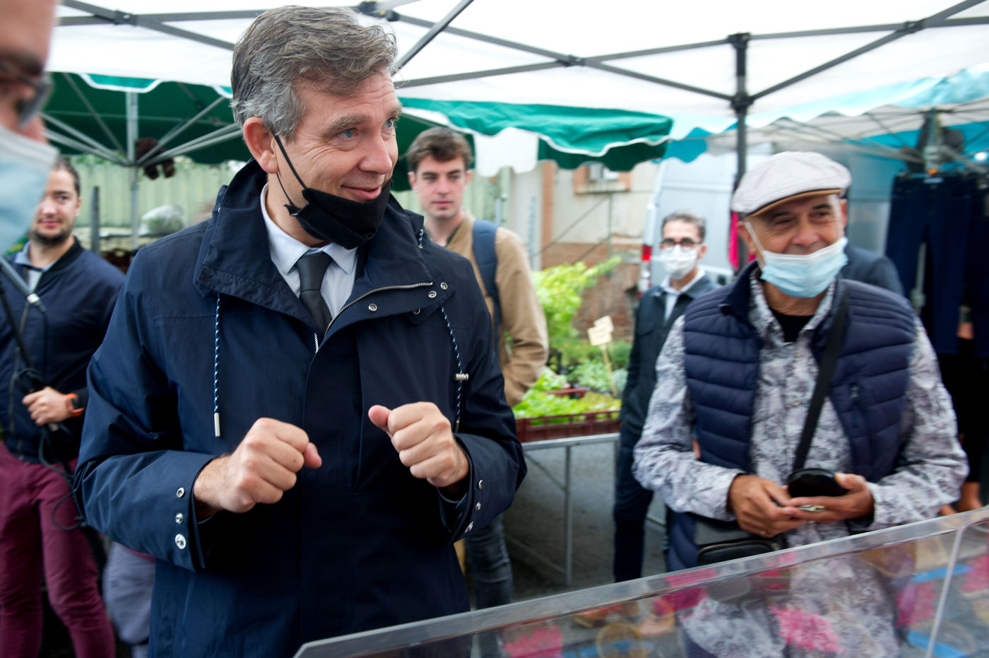 Arnaud Montebourg ancien ministre de l'économie et ancien membre du Parti Socialiste, candidat pour l?élection présidentielle de 2022 visite un marché de haute Garonne.
