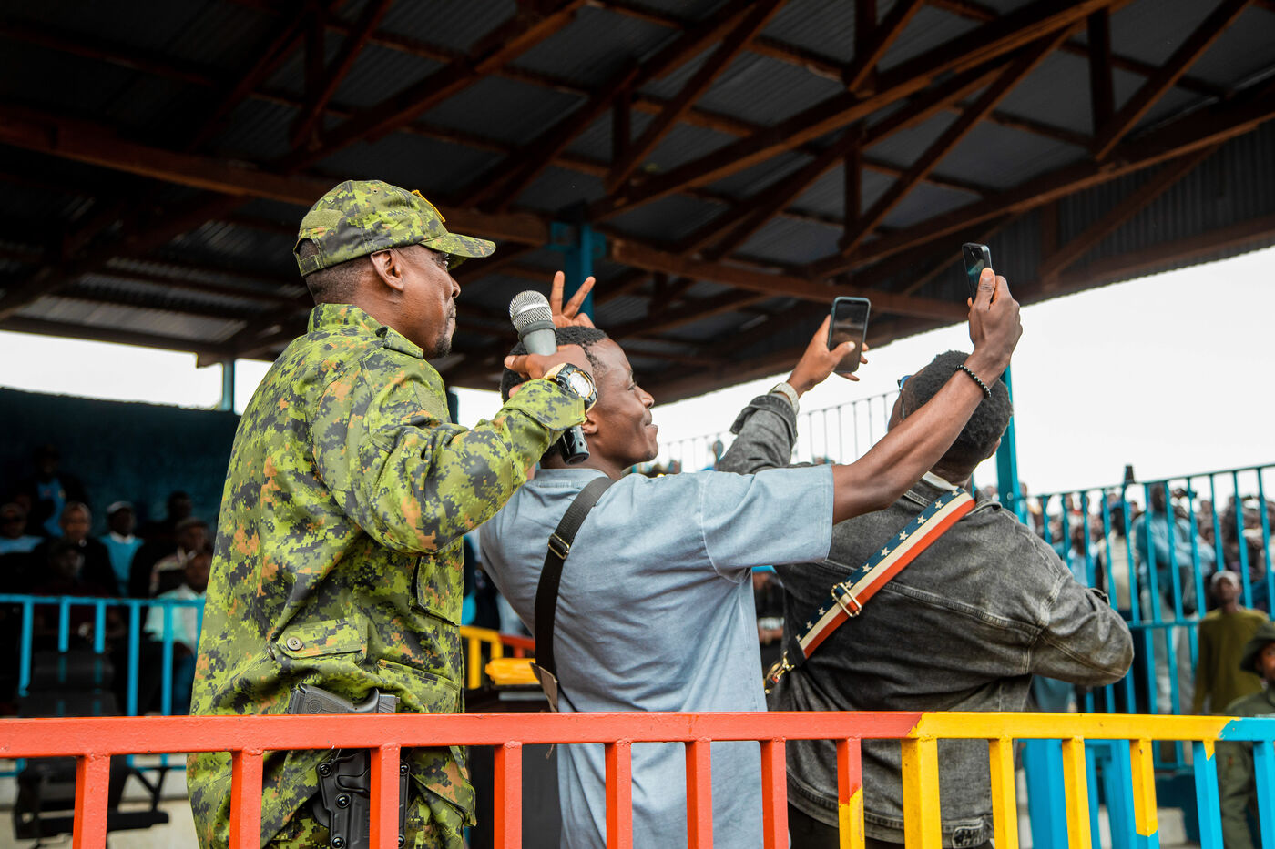 Premier meeting populaire sous controle de la rebellion du M23 (Mouvement du 23 Mars) et de leur branche politique AFC (Alliance du Fleuve Congo) au Stade de l’Unité a Goma en Republique Democratique du Congo le 6 fevrier 2025. La rebellion a présenté toutes les autorités nommé dans différents postes clés dont le Gouverneur de la province du Nord-Kivu et le maire de la ville avec tous leurs adjoints et d'autres autorités politico-administratives.