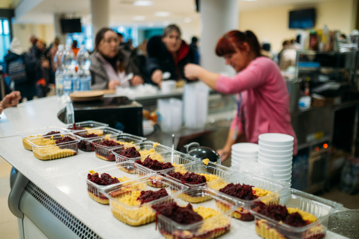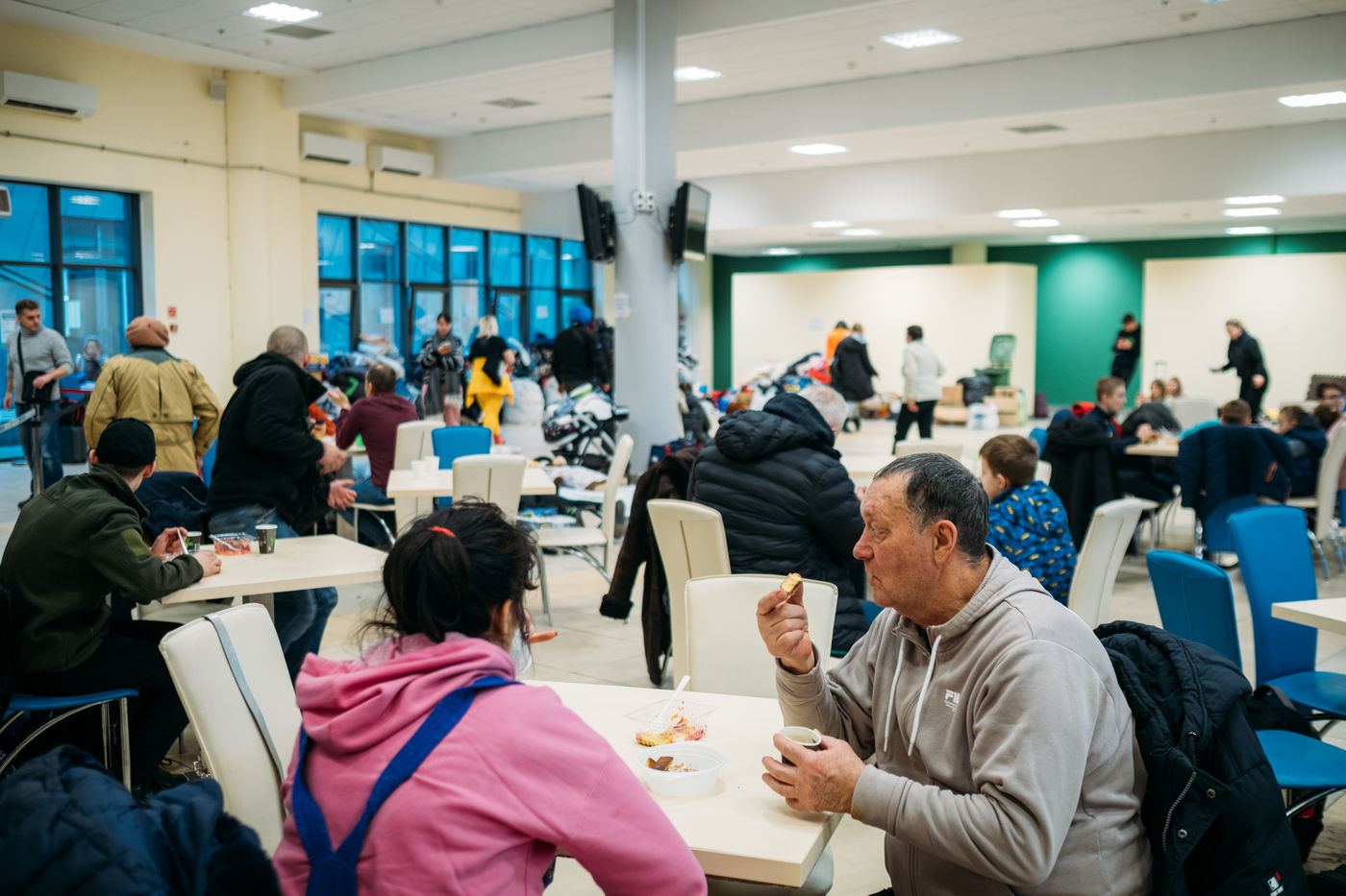 The Lviv Arena is a 40,000-seat stadium, which was the venue for the UEFA European Cup in 2012. Today, its basement is transformed into a huge reception centre where refugees from the east and Kyiv take a rest, a meal and a little warmth before the exodus to Europe.