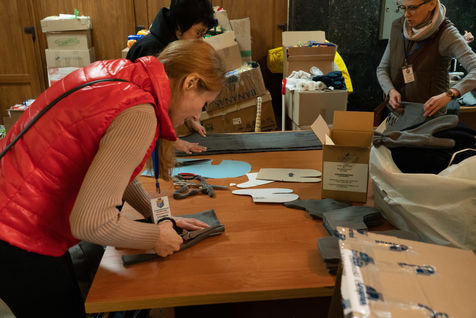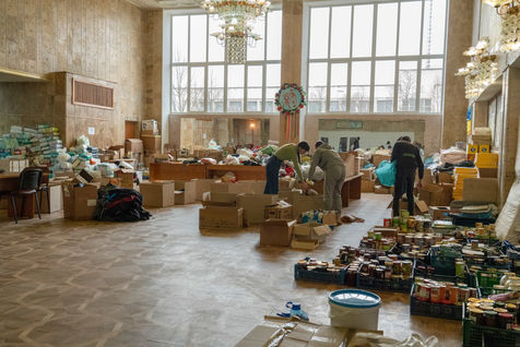En face de la mairie, le centre administratif est transformé en centre de collecte pour l effort de guerre. La nourriture arrive de Pologne principalement par les ONG. Les volontaires s occupent du transport et de la logistique en Ukraine ».
