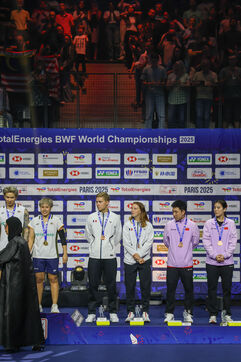 Clichés des différents podiums des championnats du monde de badminton 2025 qui se sont déroulés du lundi 25 au dimanche 31 août 2025 à Paris dans l'enceinte de l'Adidas Arena.