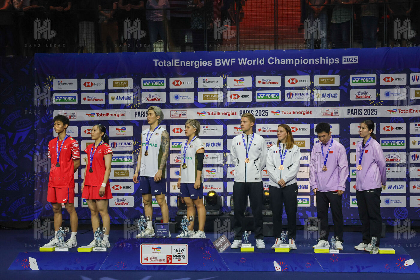 Photos of the various podiums at the 2025 Badminton World Championships, which took place from Monday 25 to Sunday 31 August 2025 in Paris at the Adidas Arena.