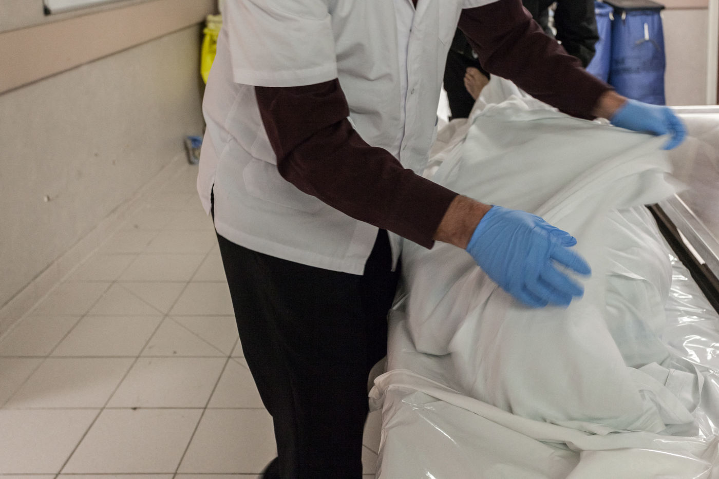 Lorsque quelqu'un décède dans un service, les infirmiers de la chambre mortuaire vont chercher le corps dans l'hôpital, le transfère dans une housse hygiénique blanche et le ramène vers la chambre mortuaire en traversant l'hôpital.