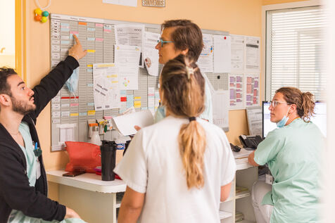 Autour des nourrissons, infirmiers, infirmiers puericulteurs (IPDE), pediatres et auxiliaires de puericulture (AP) s affairent. Au total, ce sont trois infirmiers (dont IPDE) et un AP qui sont presents sur chaque poste horaire pour prendre en charge les petits patients.