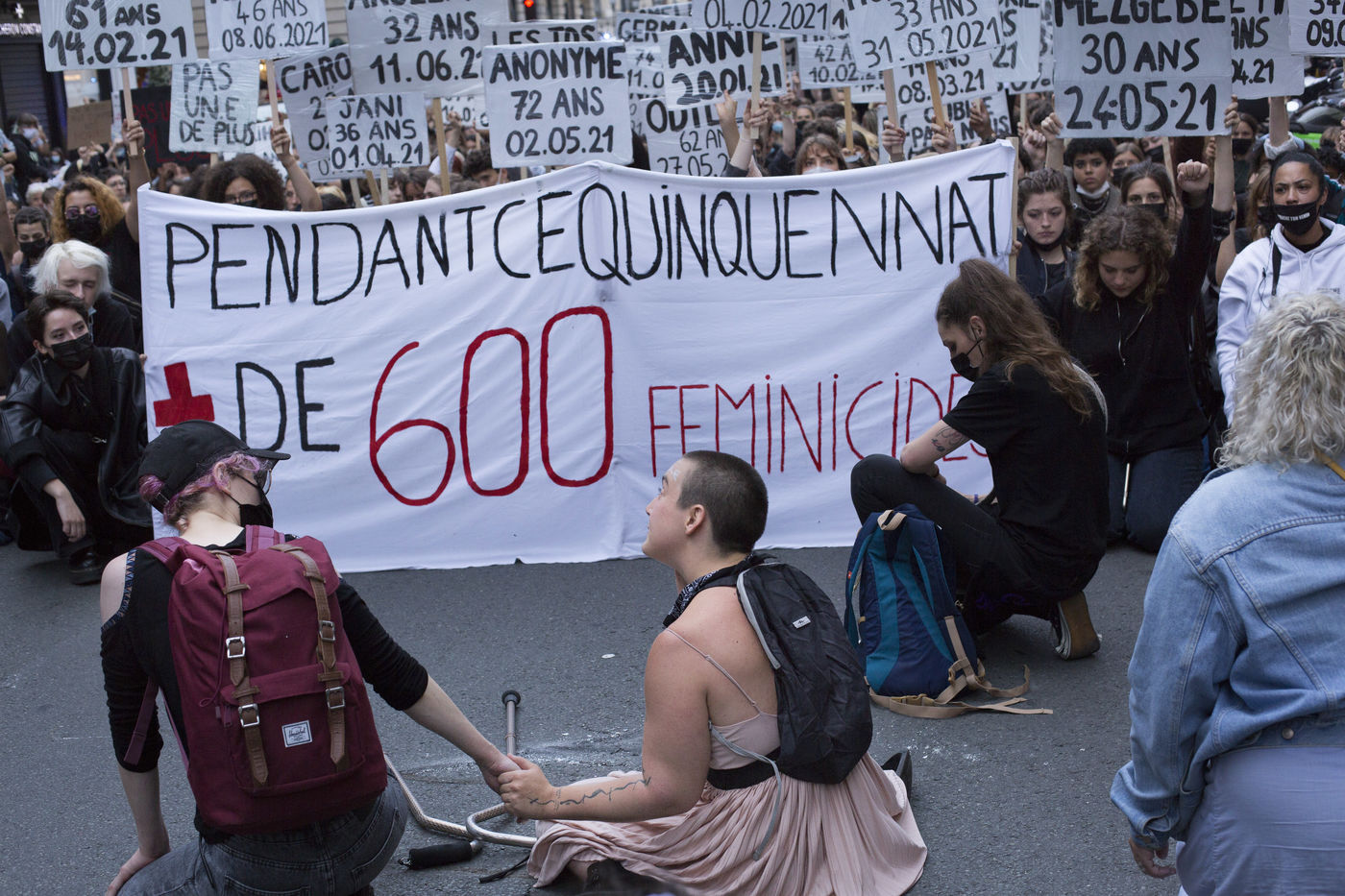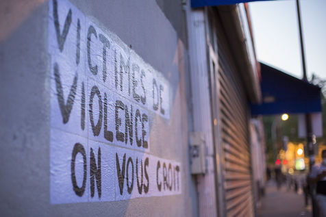 Their names are Louise, Ana, Alice, Leila, Lola ... These activists have joined the group of gluers founded by Margeritte Stern. They denounce the feminicides in France through white A4 sheets where black letters are painted by hand. According to criteria of textures and location, the gluers launch themselves with precision and speed to glue. Quickly, each one has its role for each sentence. One passes a first brush stroke, the second lays out the third goes over while a fourth guesses.