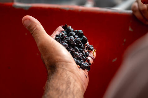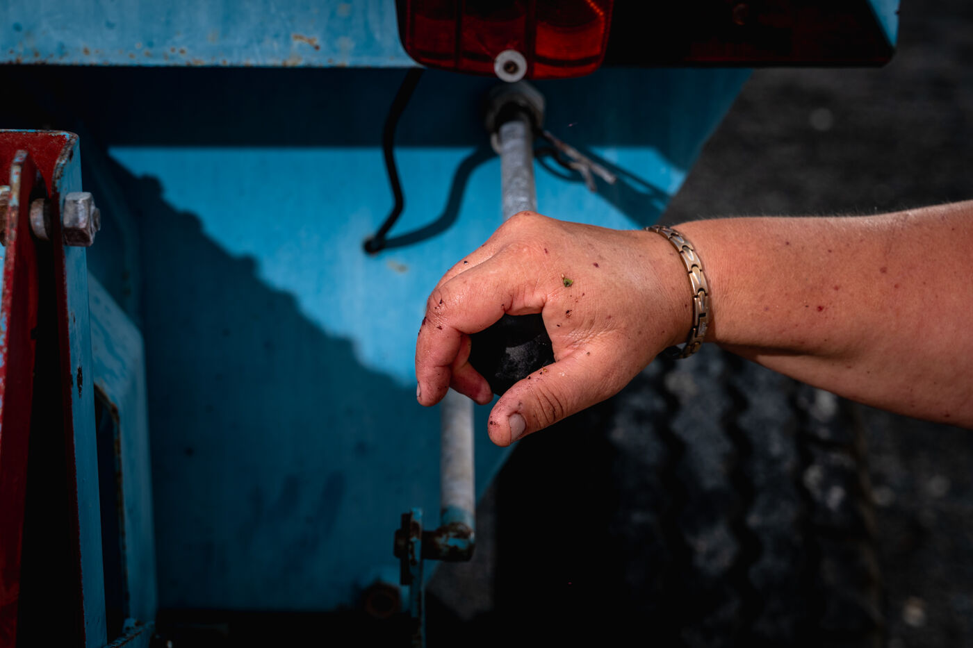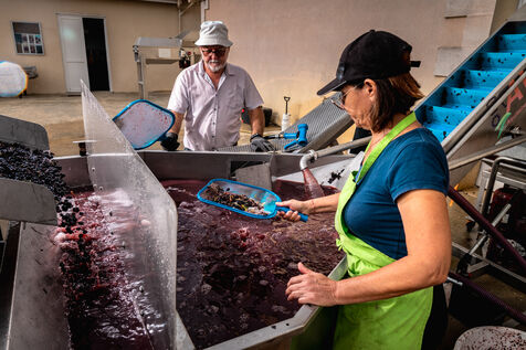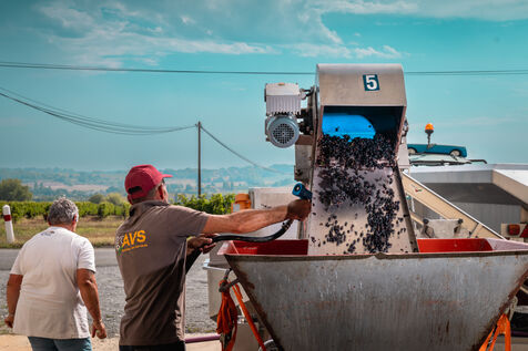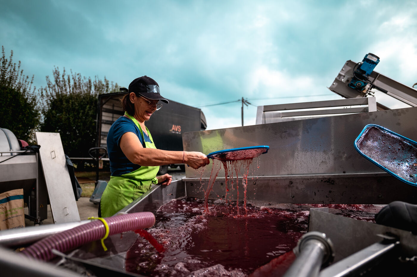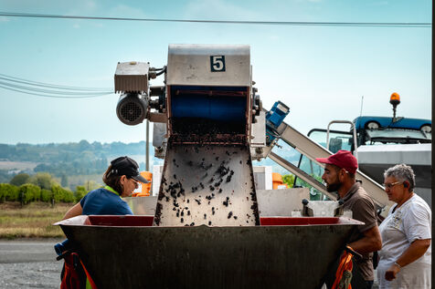 Day-long harvest at a château in the Blaye Côtes de Bordeaux appellation, with grapes sorted by densimetric bath using the FLOTATRIE process. Density sorting allows the right berries to flow into the wine, leaving grapes affected by mildew or bunchworm at the surface.