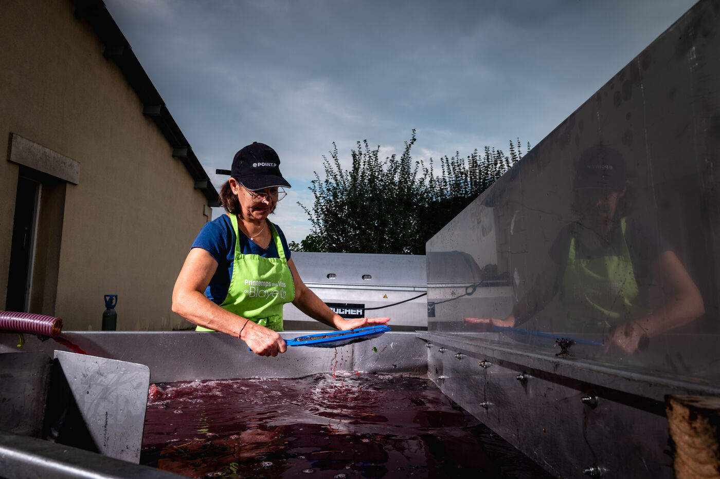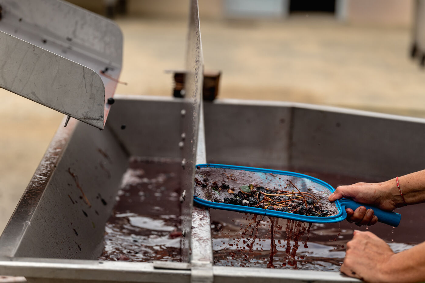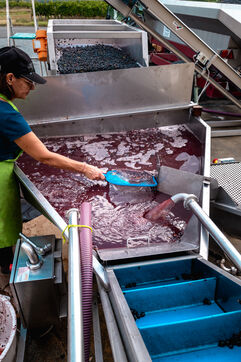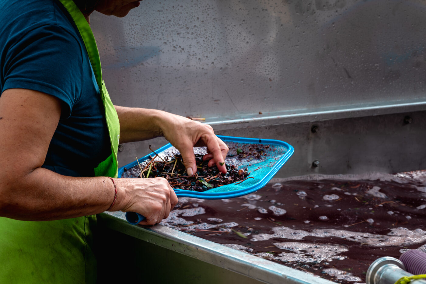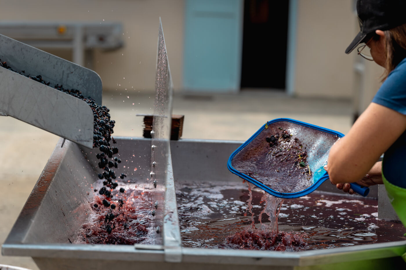 Journée de vendanges dans un château de l'appellation Blaye Côtes de Bordeaux avec tri des baies raisins par bain densimétrique par le procédé FLOTATRIE. Le tri par densité permet de faire couler les bonnes baies à vinifier et de laisser à la surface les raisins touchés par le milidiou ou le ver de grappe.