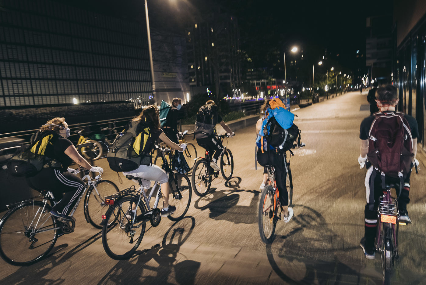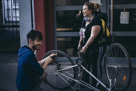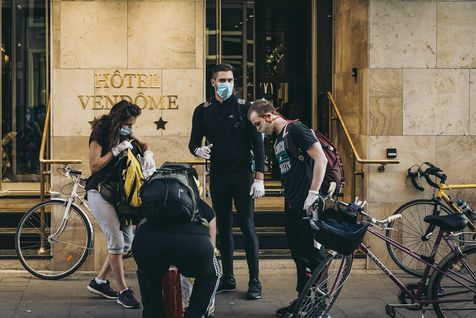 Une partie des repas est destinée aux personnes hébergées par l'État dans des hôtels comme ici, principalement des familles déboutées de la demande d'asile, sans ressources, sans domicile. Le reste sera distribué dans la rue. Notre groupe de volontaires s'apprête à partir en maraude. Ce sont Les Vélos du Coeur.
