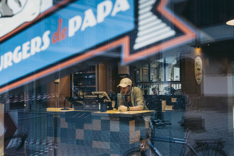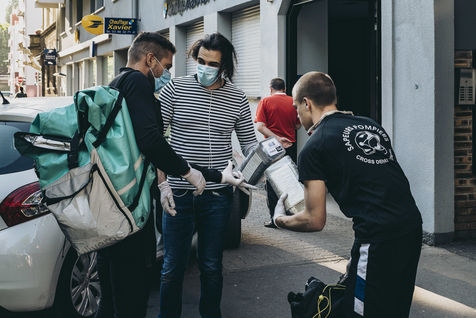 Les cyclistes se séparent. Le gros de la troupe va livrer deux autres hôtels à proximité de la gare. Pablo part de son côté pour récupérer une dizaine de burgers offerts par un restaurateur de Strasbourg qu'il connaît bien. Ils ont fait connaissance parce qu'il est livreur à vélo pour une plateforme en ligne depuis plusieurs années. En chemin il distribue déjà quelques repas à des