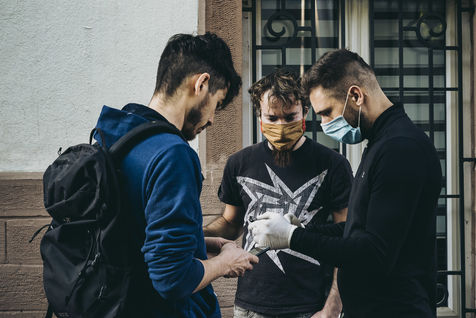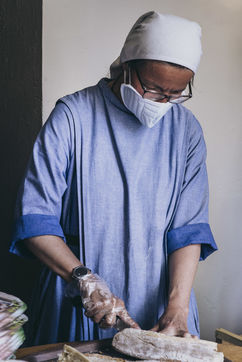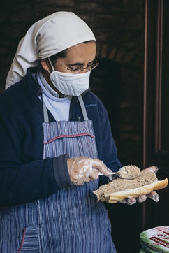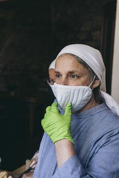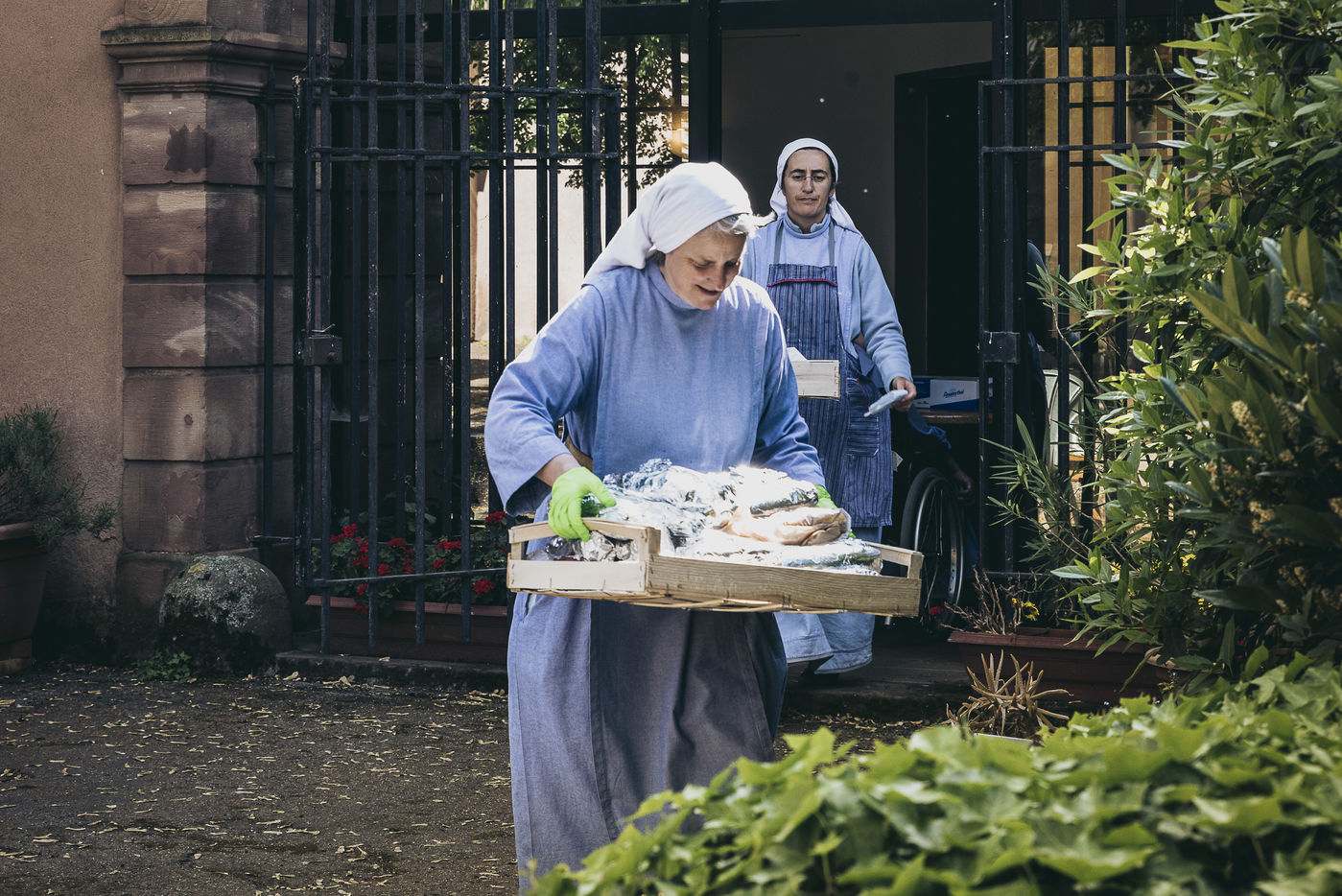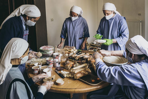Arrivent Raphaël et Julien sur leurs vélos, chargés de bouteilles d'eau minérale récupérées dans un supermarché de la ville. Puis des frères séminaristes viennent livrer 60 repas qu'ils ont préparés dans l'après-midi. Petit à petit, d'autres personnes se présentent, leurs sacs pleins de repas, cuisinés par des particuliers ou des restaurateurs, de masques cousus le jour même, de gants, de barquettes en aluminum... Il y a là Marie, Gwennaelle, Sonia, Pablo, Isabelle et d'autres encore. La petite dizaine de bénévoles se retrouve dans la salle à manger de l'établissement pour trier et répartir un total de plus de 160 repas.
