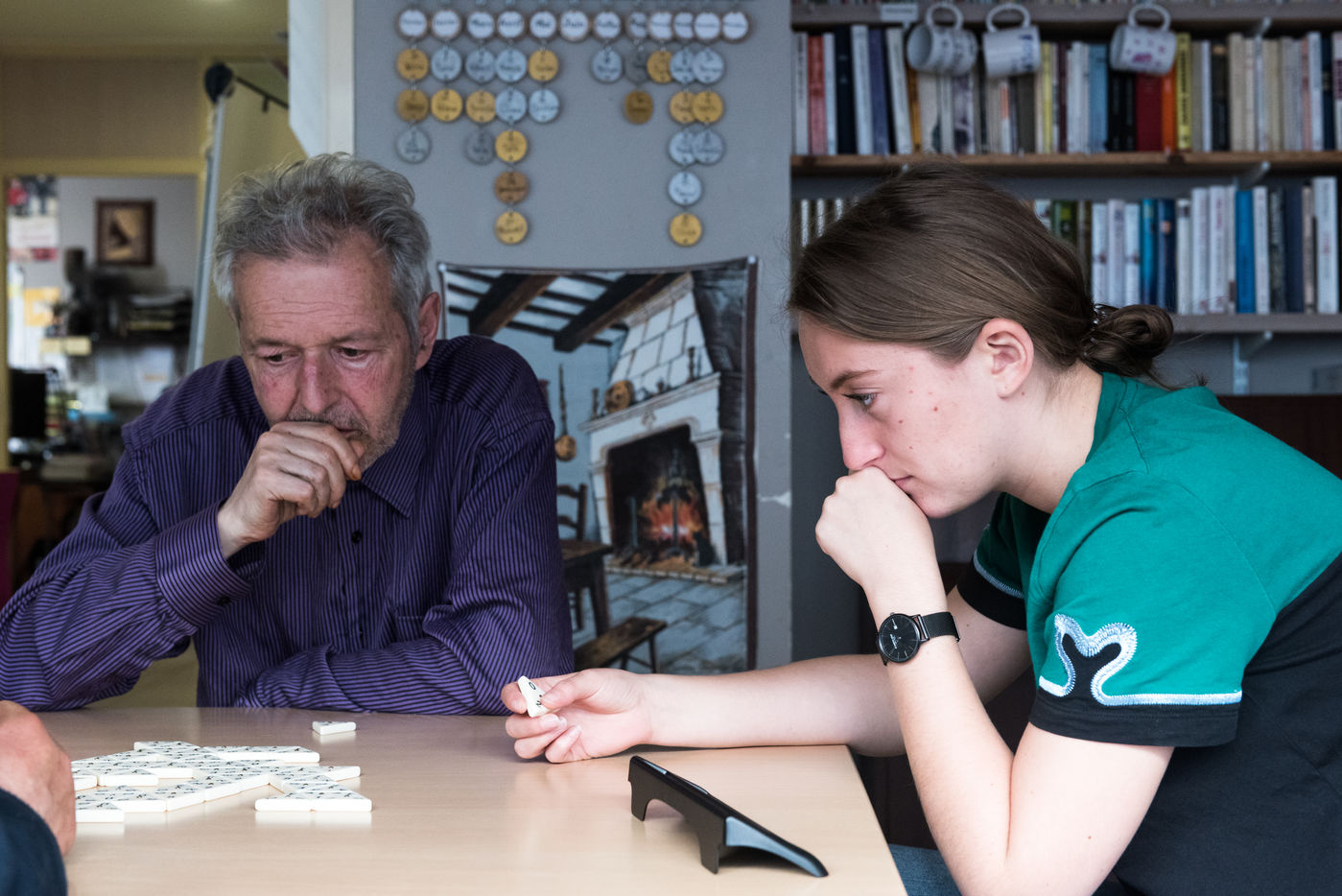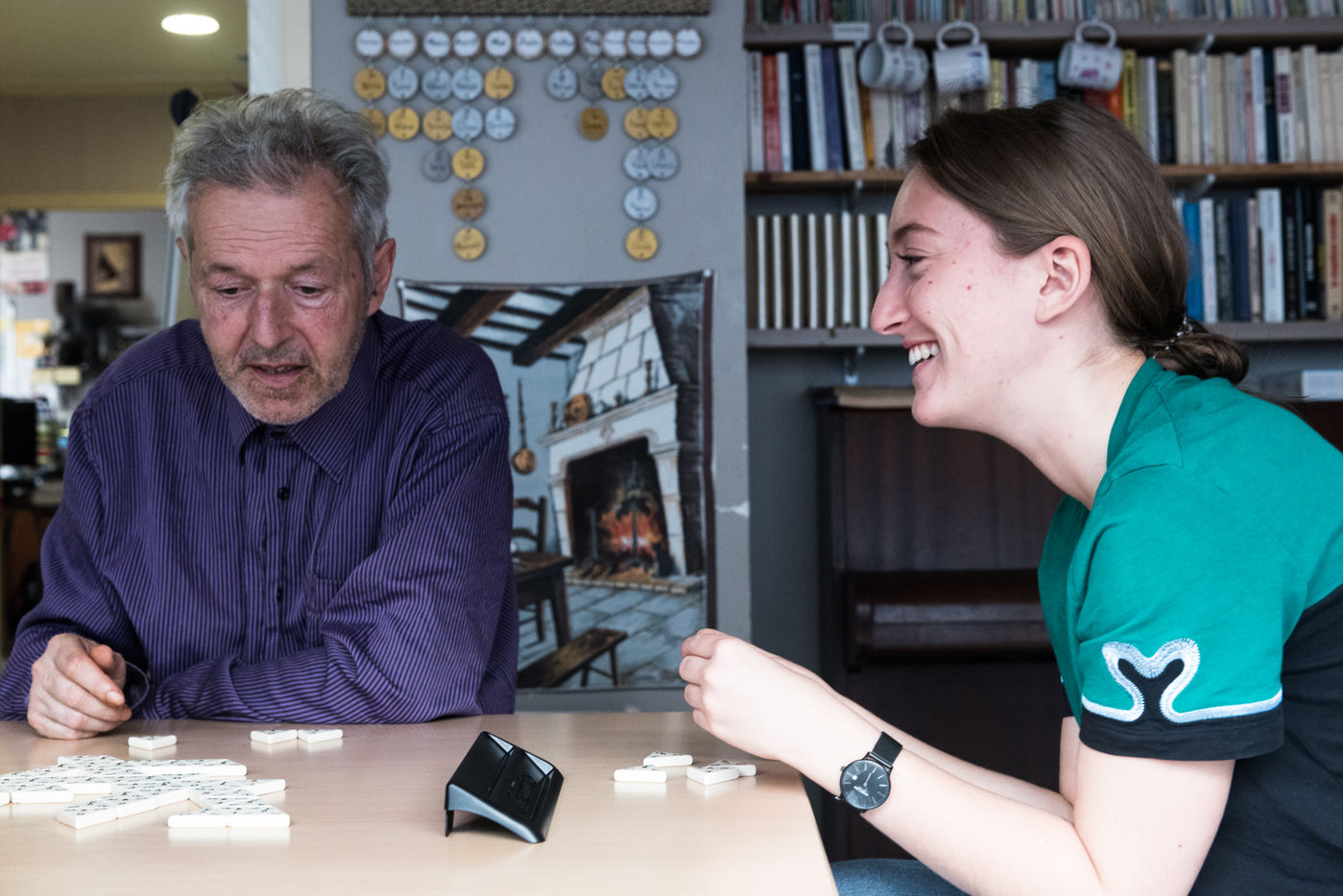 06/06/2021, Paris, France. A volunteer at the Petits Freres des Pauvres, at the Anne-Marie Blaise structure which welcomes 14 residents over 50 years old with limited resources. She spends 2 hours a week with the residents. They play board games and chat.