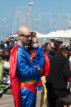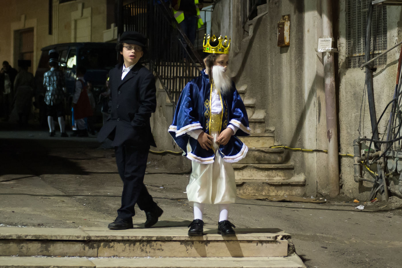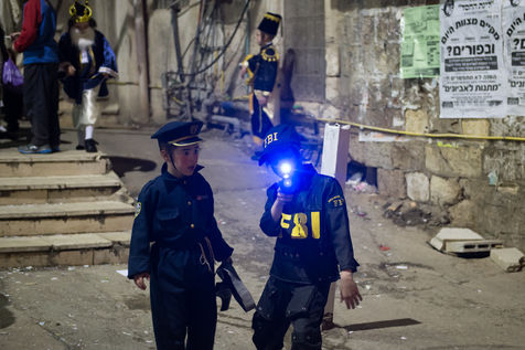 Purim is a spring holiday that commemorates the Jewish community's escape from collective destruction in the ancient Persian Empire. Jews are instructed to drink until they can tell the difference between the good and the evil, or between Mordecai and Haman. Ultra Orthodox Jewish dressed in costumes in the ultra-Orthodox Jewish neighborhood of Mea Shearim, Jerusalem, Israël.