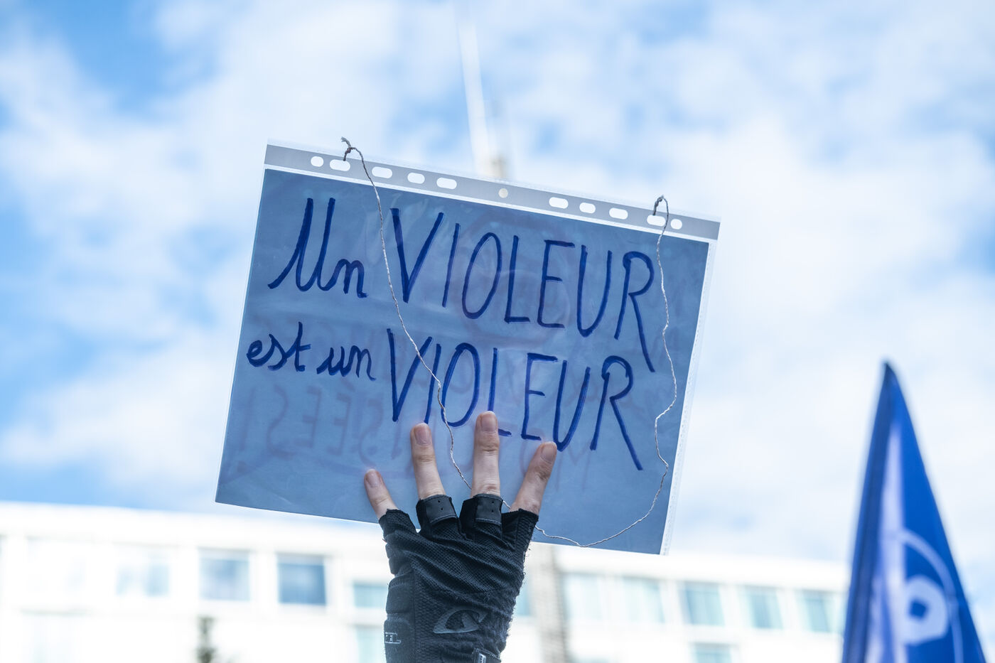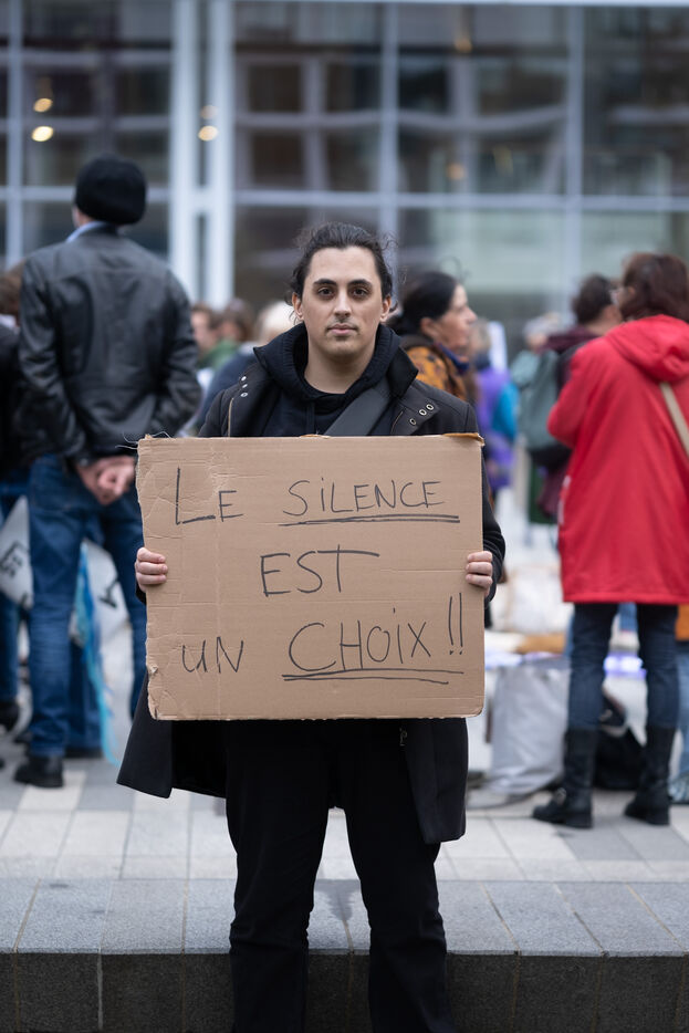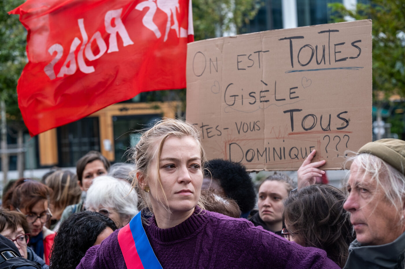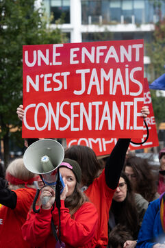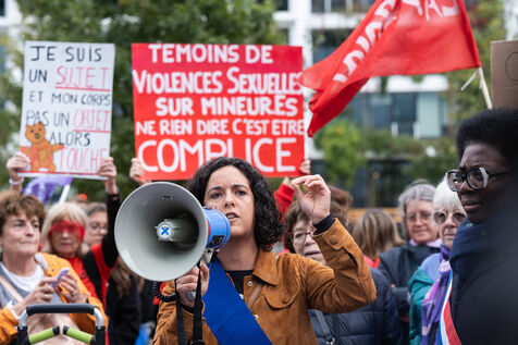 Rally in front of the courthouse of Paris in support of victims of sexual violence. Demonstrators highlight current events such as the trial of the Mazan rapists, revelations about Abbe Pierre, rape and murder of Philippine, to demand a comprehensive framework law against sexual violence and financial resources to combat it.