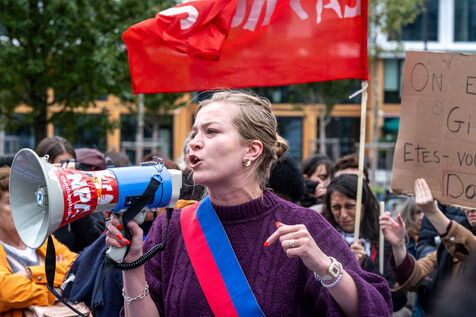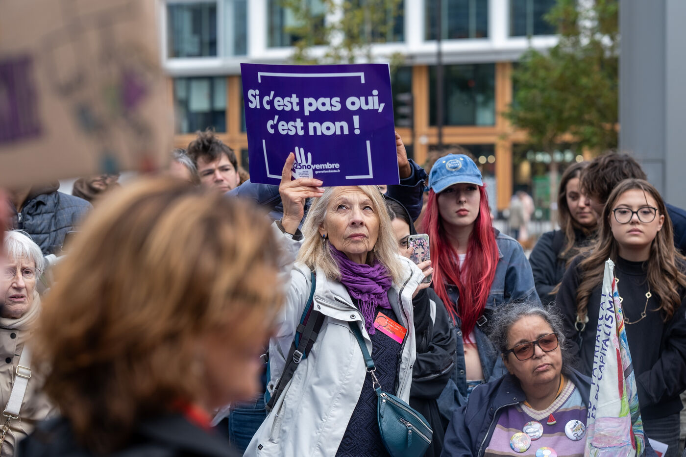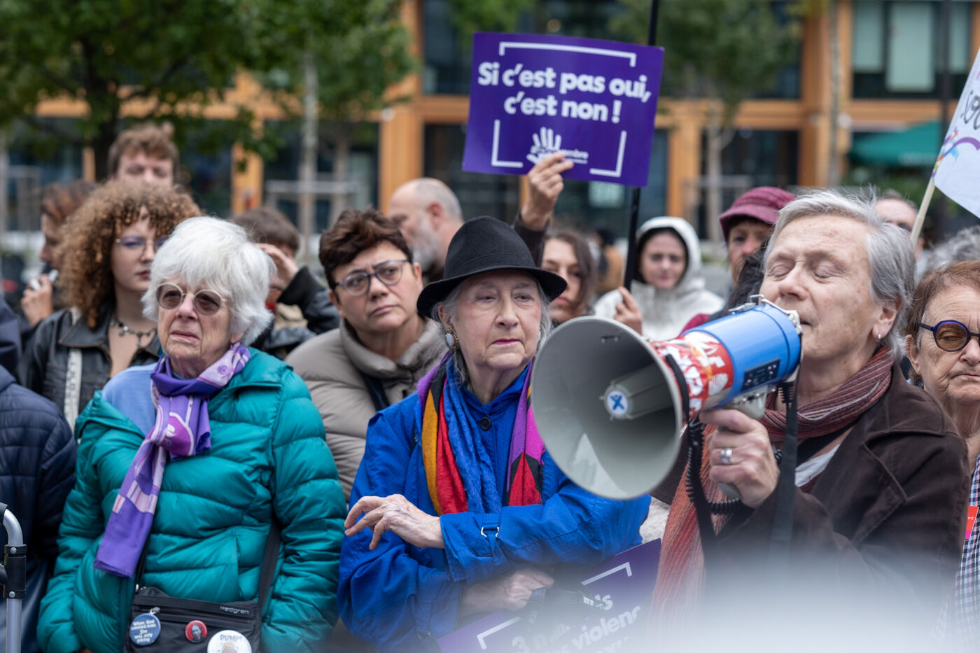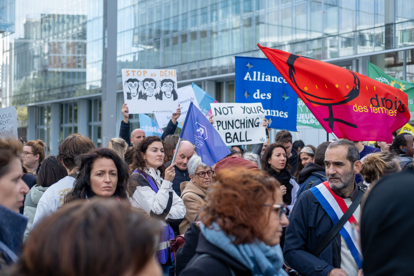 Rally in front of the courthouse of Paris in support of victims of sexual violence. Demonstrators highlight current events such as the trial of the Mazan rapists, revelations about Abbe Pierre, rape and murder of Philippine, to demand a comprehensive framework law against sexual violence and financial resources to combat it.