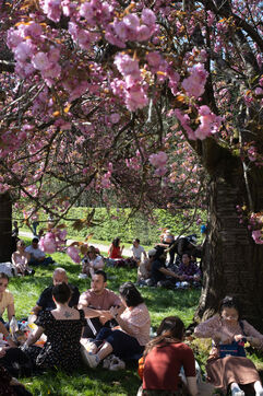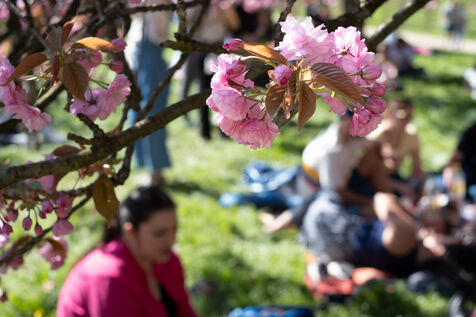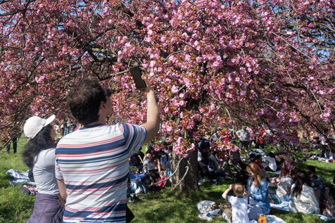 Les visiteurs du Parc de Sceaux viennent contempler les cerisiers en fleurs.