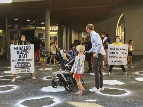 Paris. 23rd June 2020. Action of the Alternatiba movement in front of the Saint Merri elementary school in the heart of Paris, the most polluted emblematic school of the capital. Action to raise awareness on climate issues, the need for a climate and social transition. Action to question politicians and remind candidates of their commitments before the second round of municipal elections. Photograph by Chau-Cuong Le / Hans Lucas.
