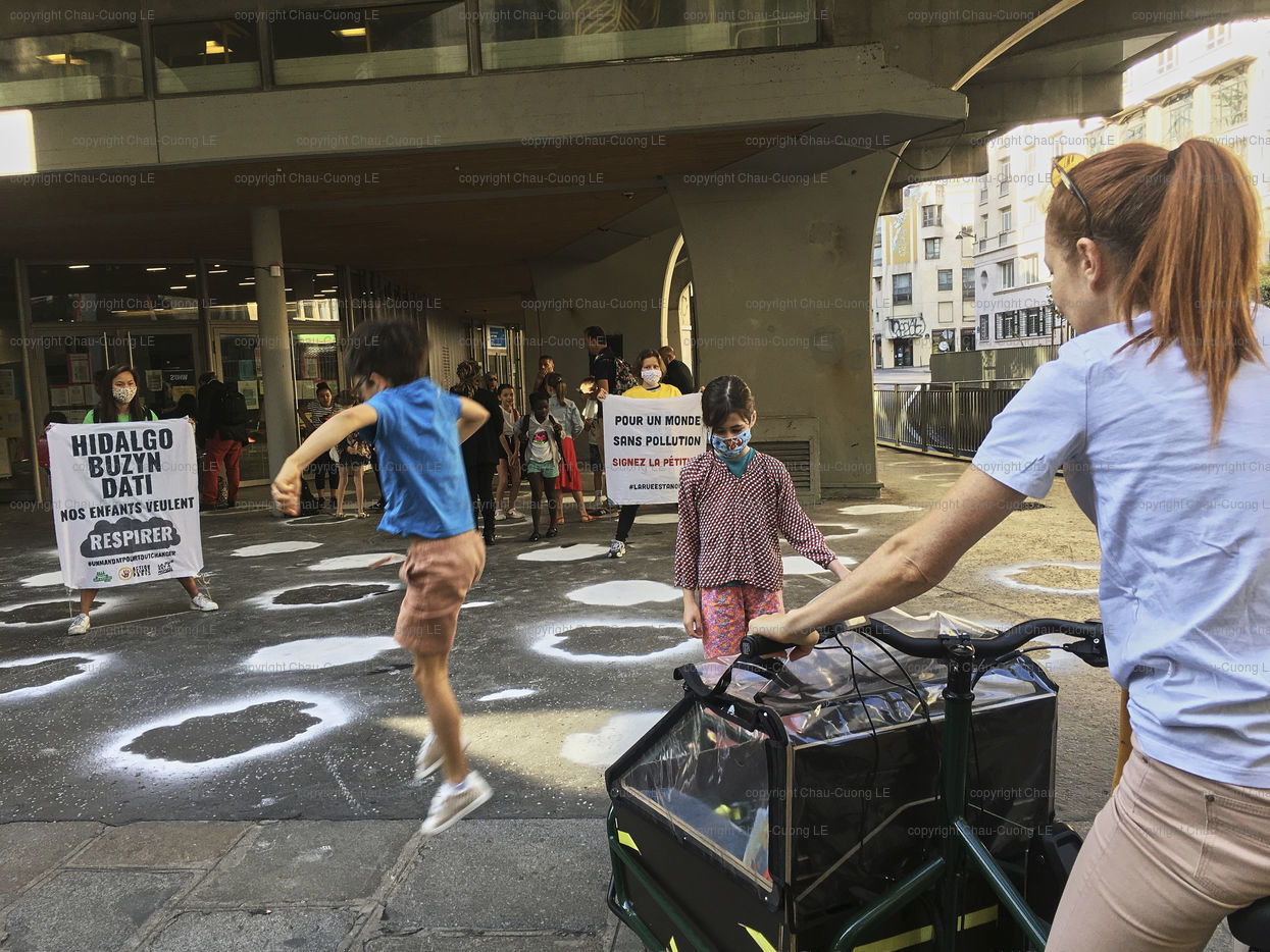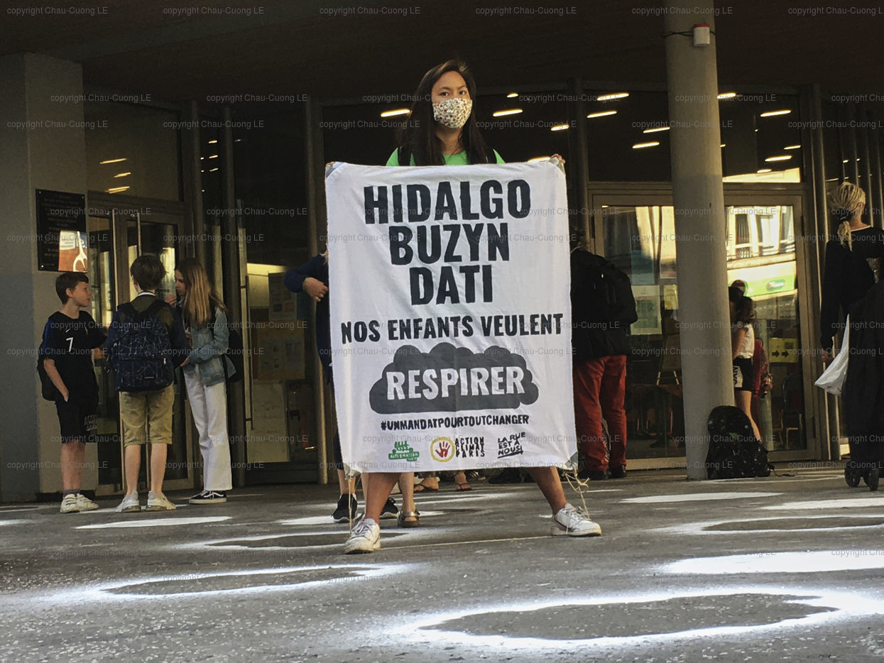 Paris. 23 Juin 2020. Action du mouvement Alternatiba devant l ecole elementaire Saint Merri au coeur de Paris, ecole emblematique la plus polluee de la capitale. Action de sensiblisation sur les enjeux climatiques, la necessite d une transition climatique et sociale. Action pour interpeller les politiques et rappeler les engagements des candidats avant le second tour des elections municipales. Photographie de Chau-Cuong Le Hans Lucas.