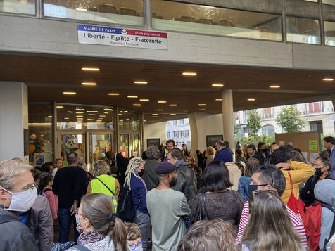 France. Paris. 2021-09-02. Saint Merri primary school and Renard elementary school in the 4th arrondissement. The children enter the school with their parents who came to accompany them. The sanitary measures taken by the schools are still in place. The protective mask against covid 19 is now part of the mandatory equipment for the start of the school year. On this day, 12 million children are going back to school in France.