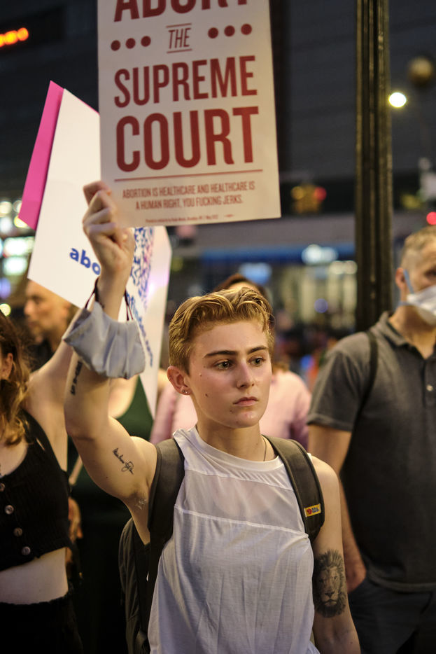 Etats Unis. New York. 2022-06-24. Ce 24 juin, la Cour supreme des Etats-Unis annonce revoquer l arret "Roe v Wade", qui garantissait le droit a l avortement pour les Americaines. Chaque Etat peut desormais decider d interdire l avortement sur son sol. Joe Biden estime que "la sante et la vie des femmes de ce pays sont maintenant en danger". Comme partout dans le pays, des milliers de personnes se sont mobilisees pour defendre le droit a l avortement, menace par la Cour supreme. Entre larmes, colere et promesse de poursuivre la bataille. Des dizaines de collectifs, d associations et d organisations politiques et militantes, des milliers de femmes et d hommes en colere ont inonde les places de leurs villes, devant les edifices de justice du pays entier, pour y verser leur indignation face au renversement du droit a l avortement aux Etats-Unis. A New York, cette resistance s est notamment manifestee des 18h30 a l Union Square ou rassemblement, discours et marches successives se sont succede. Kathy Hochul, la gouverneure de l Etat de New York, y a pris la parole en fin de soiree denoncant la decision de la Cour Supreme et incitant les manifestants a continuer le combat.. Photographie par Chau Cuong Le / Hans Lucas.
