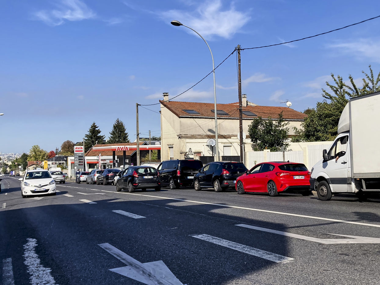 France. Boissy Saint Léger. 2022-10-11. File d'attente aux stations service suite a la penurie de carburant. La greve des salaries de TotalEnergies bloque les raffineries. Pour faire face à la pénurie d essence qui touche la capitale, les automobiliste s arment de patience aux stations service encore pourvues de carburant. Parfois, il faut se rendre en banlieue pour se ravitailler. 30,8 % des stations-service de France manquent d'au moins un carburant, selon le ministere de la Transition energétique. Les Hauts-de-France et l'Ile-de-France restent les régions les plus touchées. Photographie par Chau Cuong Le / Hans Lucas.