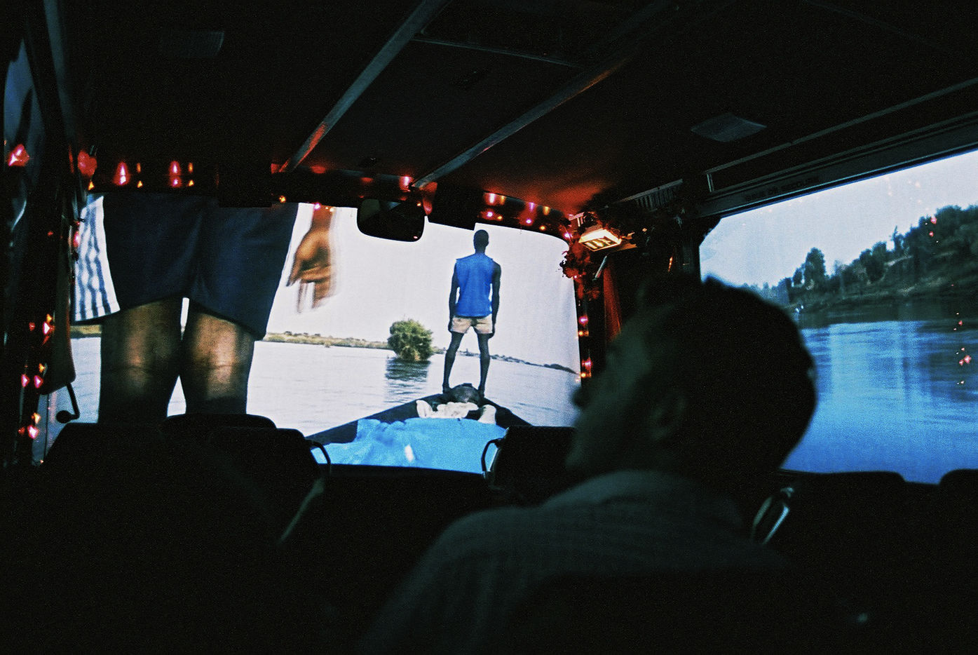 Le Caravanserail : un bus de voyage en 3D. Le bus propose des films de voyages réalisés sur les continents africain et d'Amérique du Sud. La particularité de cette structure (mise en place par le collectif d'artistes Alternative nomade) réside dans sa conception technique : les images sont projetées par plusieurs video projecteurs sur des miroirs, installés tout autour du bus, qui reflètent ainsi en retour les images sur les vitres du bus. Si bien que lorsque le spectateur est installé dans le bus, il a l'impression de voyager tout en restant physiquement immobile. Des images de vie, de parcours en pirogue, d'atterrissages en avion défilent. Totalement immergé, le spectateur vit pleinement ce "film documentaire en 3 dimensions". Autour du bus est construit un chapiteau sous lequel on peut se reposer dans un coin marocain et y boire le thé, regarder les diverses expositions de photos ou installations artistiques qui jalonnent les parois du chapiteau. D'autres spots de projection de films documentaires habillés de performances sonores viennent compléter le film 3D. Paris et Avignon (2004, Màj 2016)