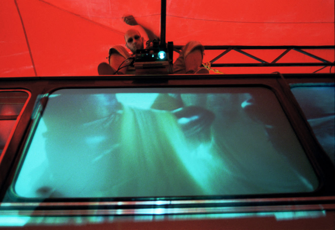Last adjustments backstage befor the opening of the bus. The Caravanserai : A nomad bus in 3D experience. The bus shows different documentary movies about the trip, being on the road. The films were shooting in African or South America continents. The distinctive characteristic of this initiative (leading by the collective of artists Alternative Nomade) resides in its technical conception : firstaval, the film is shown by several projectors on mirrors put all around the bus. After which, the film is reflected in the windows of the bus. The spectators sitting on the bus have the impressions of being on the road, living a trip even when they are physically still, motionless. Images of life, dugout lap, plane landing. Deeply submerged by the experience, the spectator do lives this documentary movie in 3D. Around the bus is settled a kind of big top where we can have a rest in the moroccan area, drink tea, have a look to different photo exhibitions. Others films are also projected on the wall of the big top. Paris and Avignon (2004, update 2016)