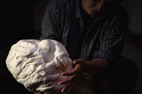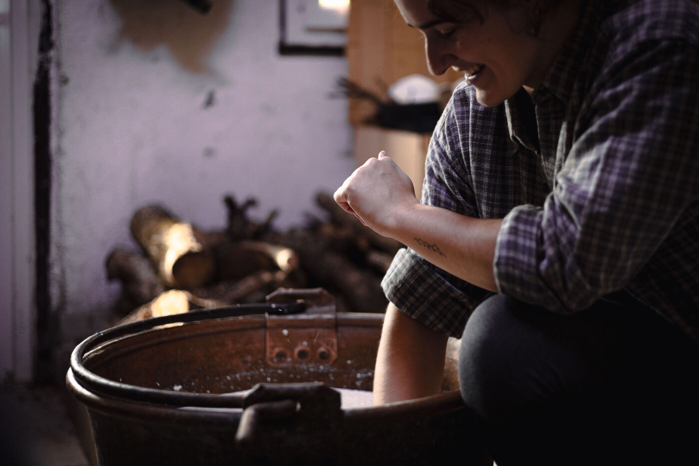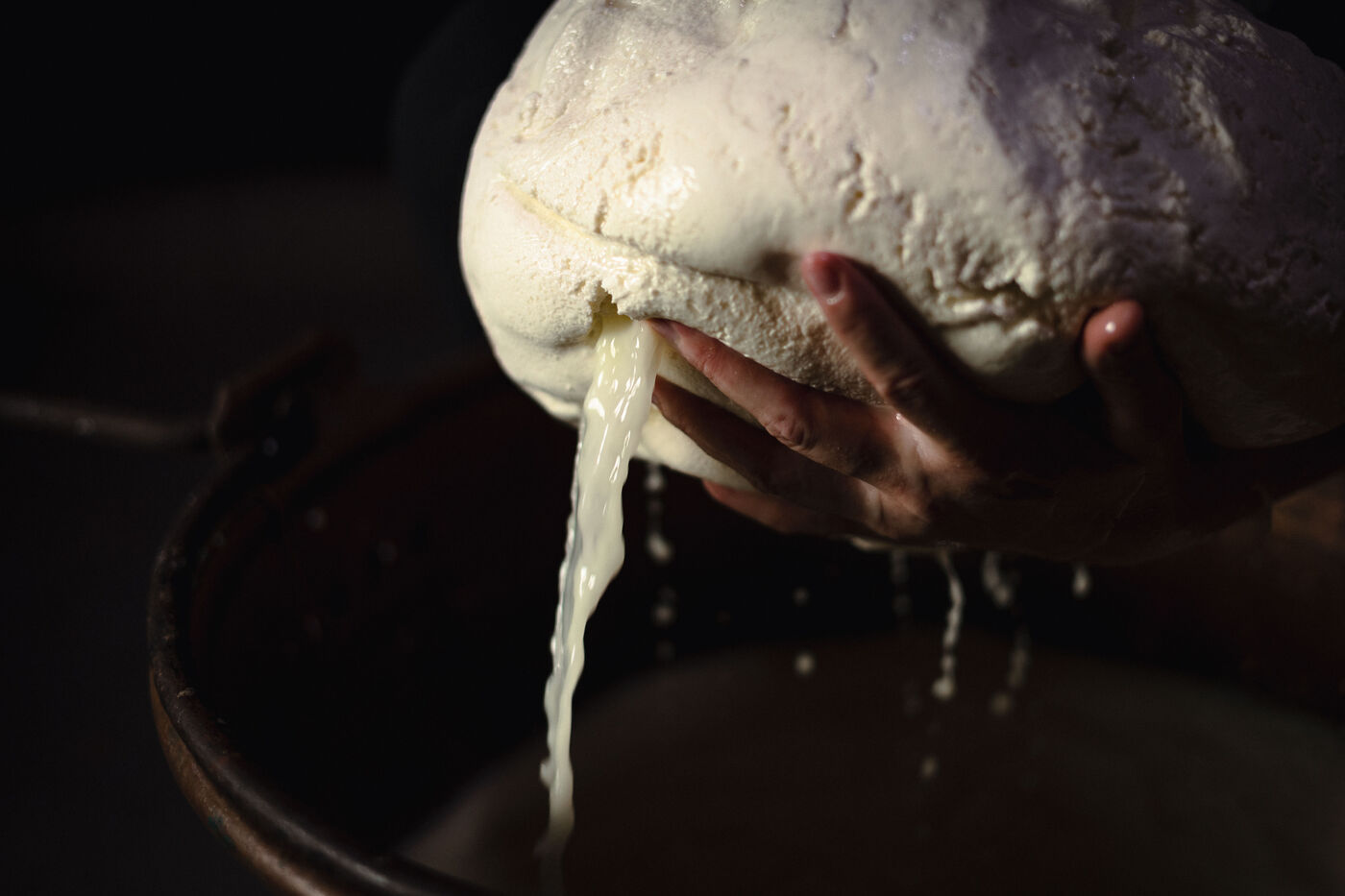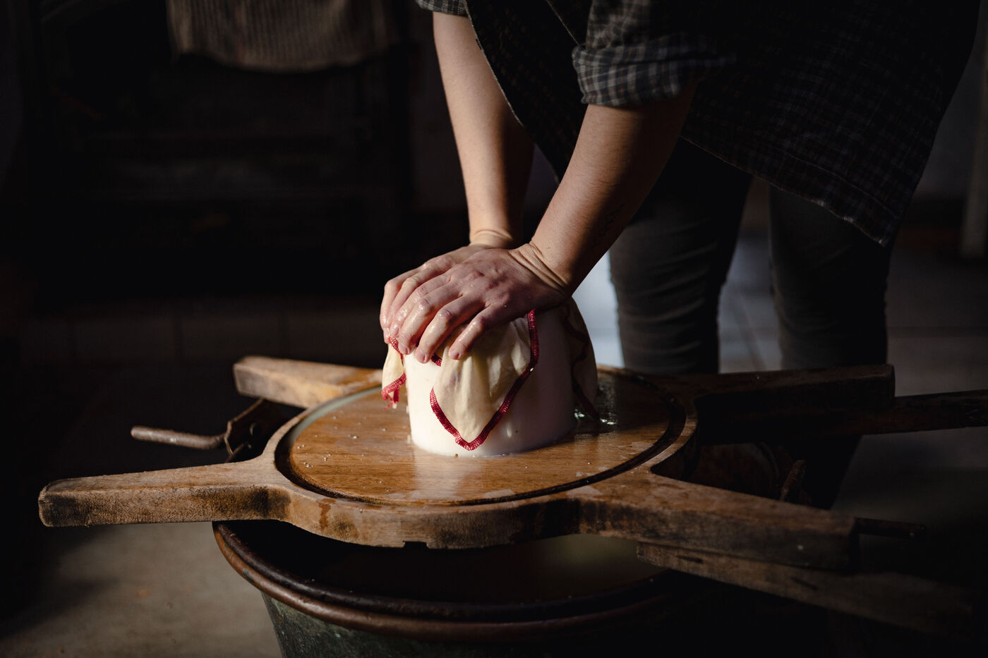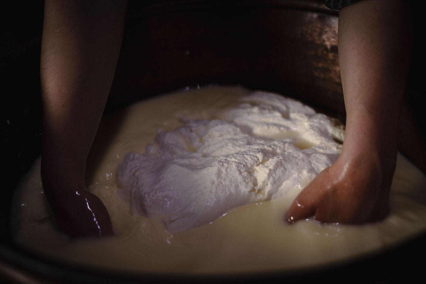 Claire then pours it into the copper cauldron that she places on a gas stove that she lights. There, she slightly increases the temperature and then she rennets it to make it curdle. A few minutes later, it is necessary to mix everything to break the curd into small grains which ends up agglomerating into a large firm ball. This ball is then cut to the size of the molds in which it will be distributed. These molds are then placed under a press until the evening or the next day, then salted and placed in the cellar where the refining will begin.