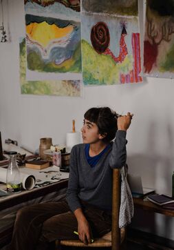 Lorsque l'on passe quelques heures avec Pyrénée, on la sent apaisée au milieu de ses brebis et quelques instants plus tard, comme un volcan en éruption devant ses feuilles de papier sur lesquelles elle peint à une vitesse incroyable, au rythme de ses visions, de ses rêves, de ses sensations.