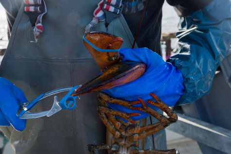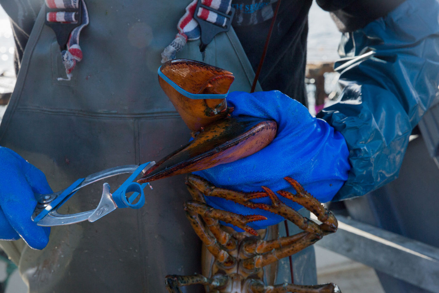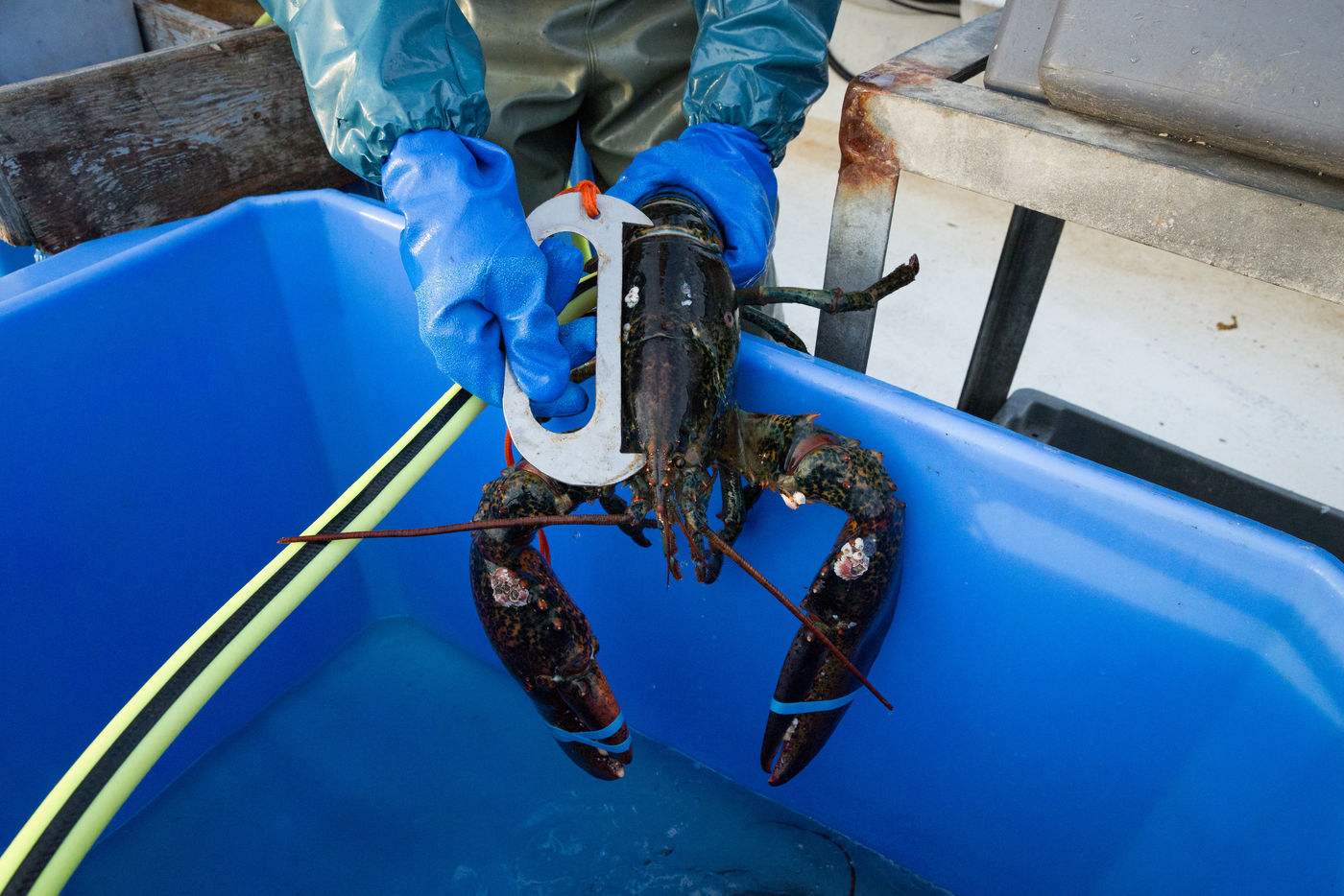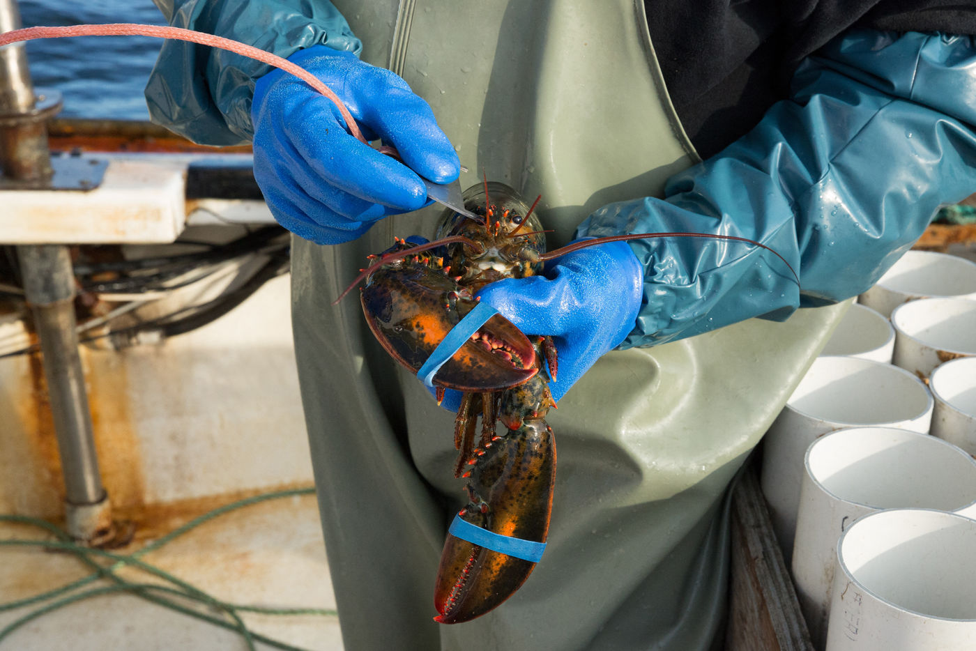 Les pinces imposantes des crustacés sont maintenues fermées avec de gros élastiques.