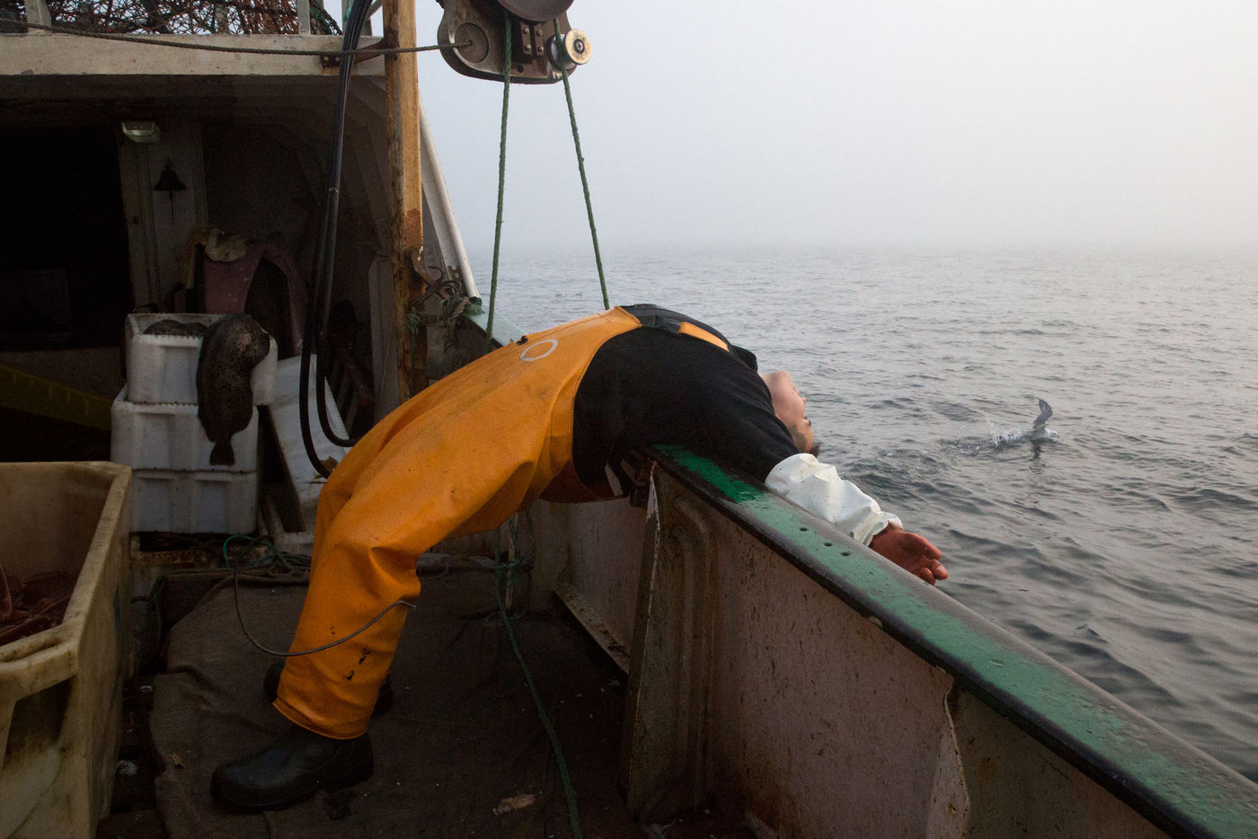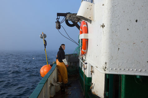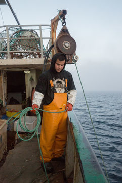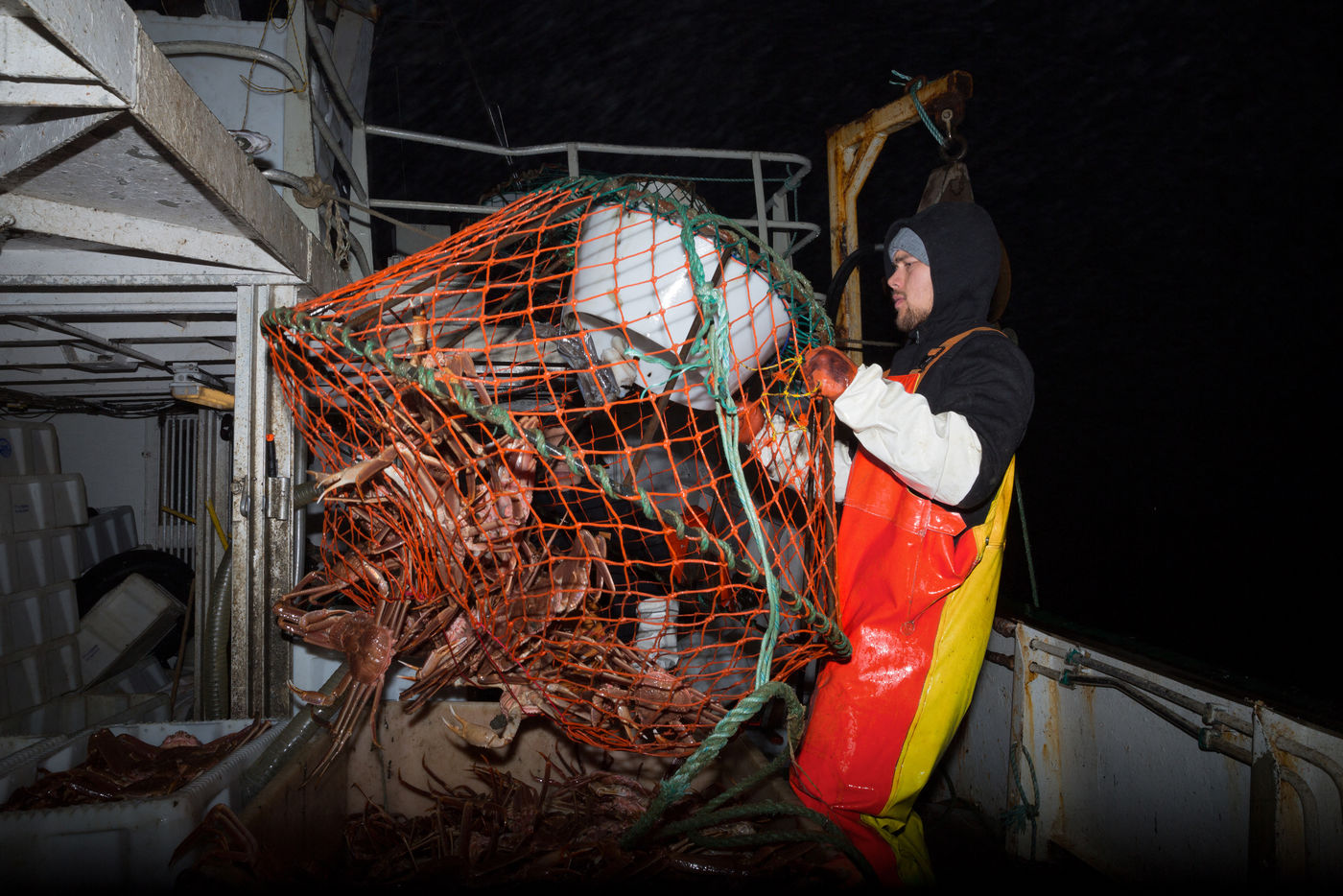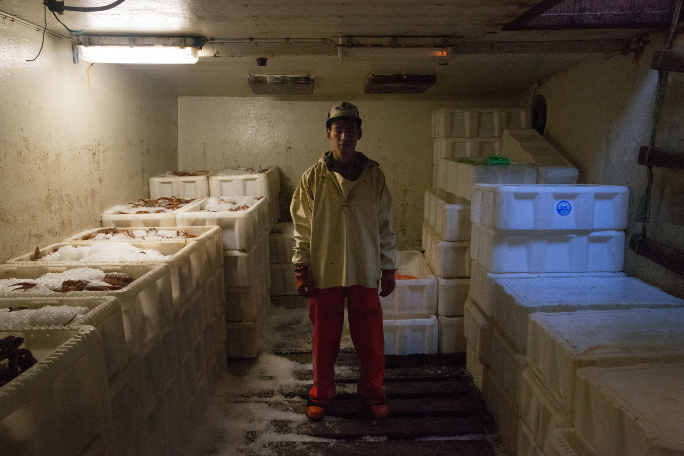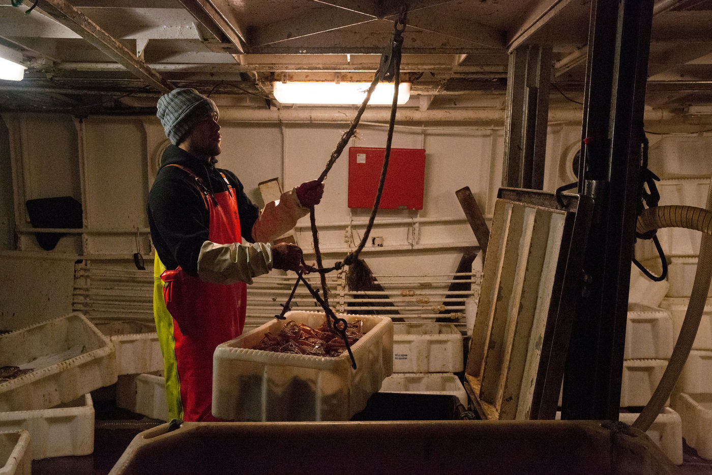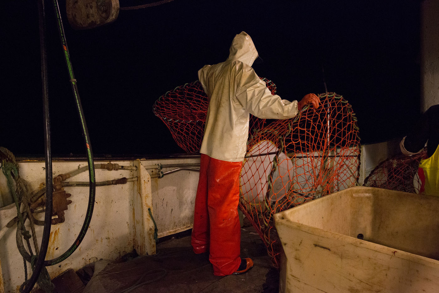 Fin août nous partons à la pêche aux crabes des neiges avec deux autres pêcheurs Groenlandais, Steven et Salik I. Les lignes de pêche sont situées à 7h de route dans le détroit de Davis, entre le Groenland et la Terre de Baffin. Les conditions climatiques sont difficiles et il faut travailler le jour comme la nuit. Les crabes sont capturés vivants dans des casiers avec l'aide d'appâts le plus souvent de la morue issue des eaux Groenlandaises. Les crabes sont triés puis stockés dans de la glace. Les plus petits et les femelles sont relâchés en mer. Les crabes sont ensuite ramenés à l'usine de poissons à Sisimiut pour être vendus. En 24h nous remontons 4 tonnes de crabes ! Salik me dit qu'il aime cette vie, libre, sur son bateau, en pleine mer, proche de la nature. Plus tard il aimerait travailler et habiter au Groenland toute l'année.