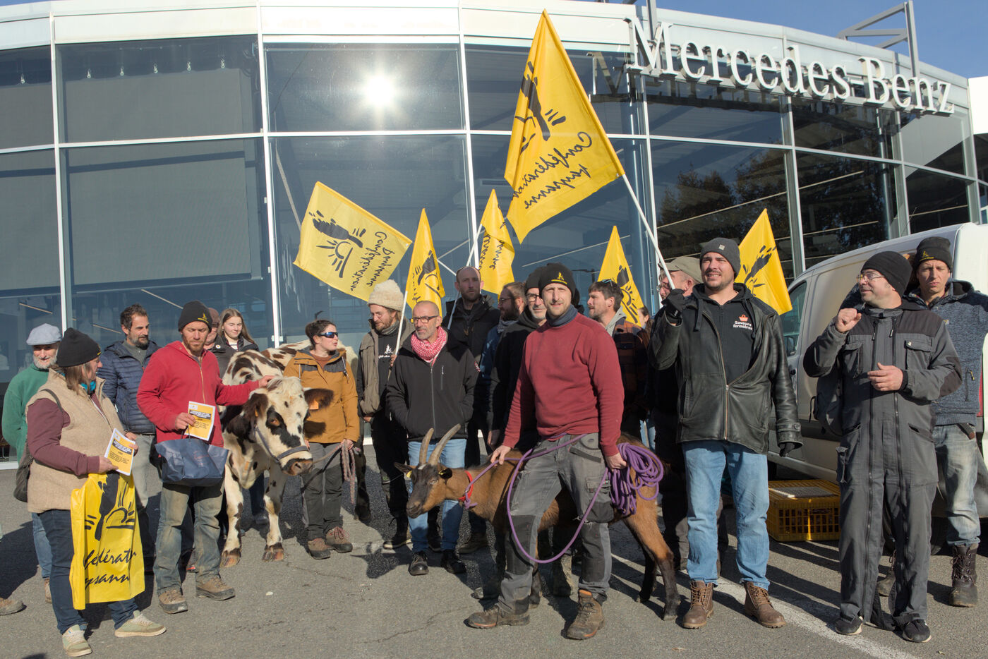 Vendredi 22 novembre, une cinquantaine d’agriculteurs et agricultrices de la Confédération paysanne se sont rassemblés devant le concessionnaire Mercedes, à Limoges (Haute-Vienne) pour dénoncer l’accord de libre-échange entre l’Union européenne et les pays du Mercosur. Pour ce syndicat, l’agriculture et l’alimentation ne peuvent pas être une monnaie d’échange dans le commerce international. Ils et elles refusent qu’on échange des animaux contre des voitures, d’où leur présence à cet endroit précis.
